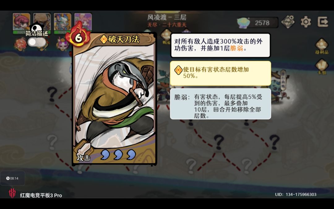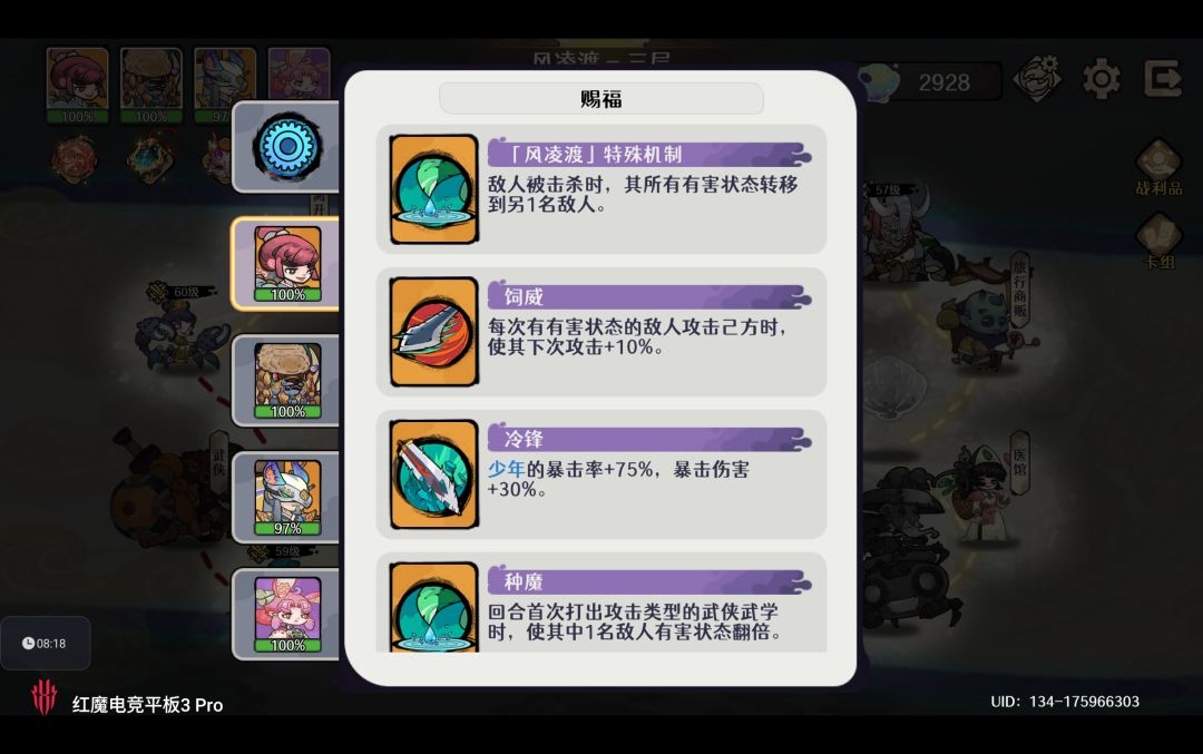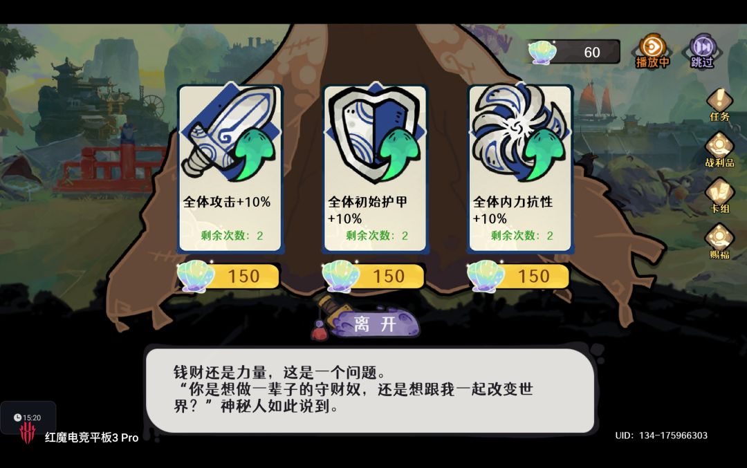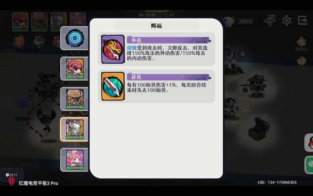 请注意由于旅行商贩的仙贝刷新费用随着层数提升而增加,我们需要尽量在进入第三层前完成 初始12张手牌的合成与词条升级。避免造成第三层仙贝资源不够的情况出现,风凌渡中很多增益赐福的收益与仙贝总数成正比例函数,特定赐福下仙贝越多剑魔伤害越高,队伍初始护甲越高。