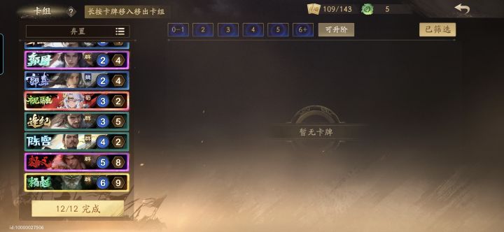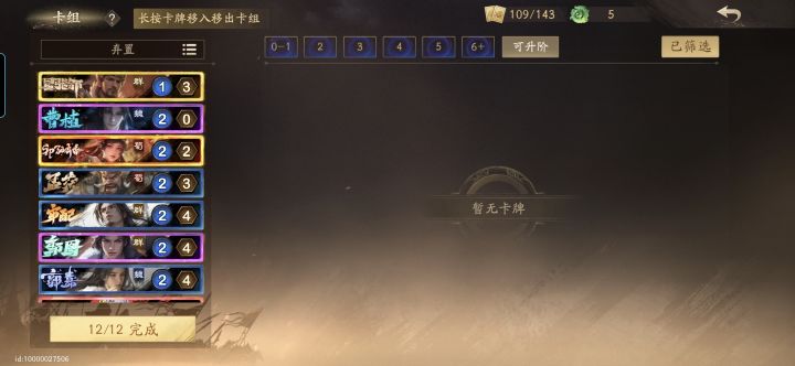 实战里面我现在开局手牌几乎抽不到星张郃,并且有时候弃置最右侧手牌也不稳定,星张郃和鞠义(实在没有的话)不是刚需可以看情况替换