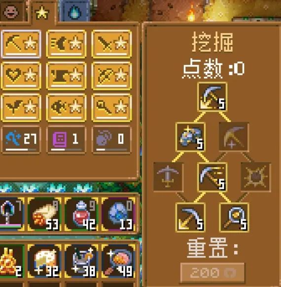 挖掘:影响开凿墙壁的伤害、速度以及矿石开采的数量。