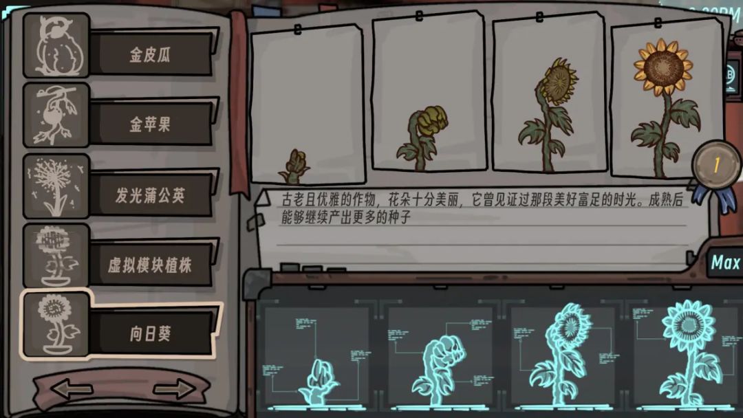 作物还可以研究升级,分为6个等级,每种作物每个等级材料需求不同,等级越高产量越高,到达最高等级还会有额外增益例如产量加倍、可持续采收等,研究员还会给你讲解作物的背景故事并提供奖励。