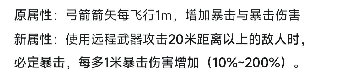 伤害上限是次要,主要的是暴击率。现在的弓箭天赋使得弓箭武器都必须暴击才能打出可观伤害。那么在20m内要打出暴击只能通过词条和天赋来增加暴击率