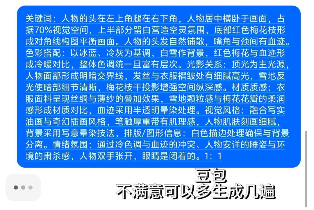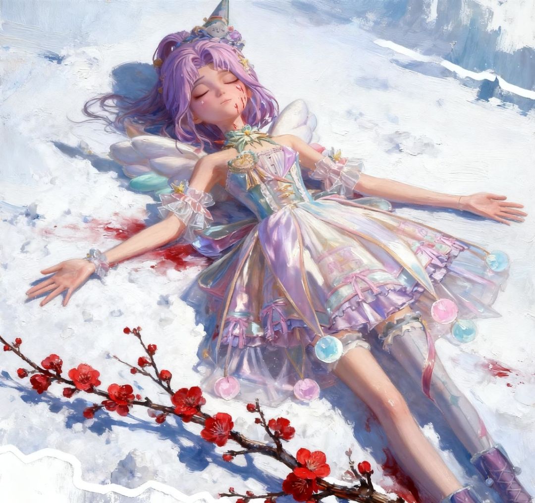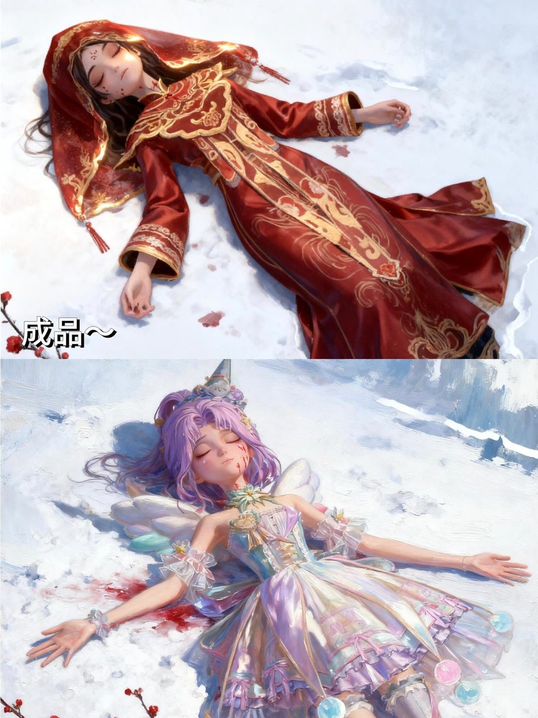 关键词:人物的头在左上角腿在右下角,人物居中横卧于画面,占据70%视觉空间,上半部分留白营造空灵氛围,底部红色梅花枝形成对角线构图平衡画面。人物的头发自然铺散,嘴角与颈间有血迹。色彩搭配:以冰蓝、冷灰为基调,白雪作背景,红色梅花与血迹形成冷暖对比,整体色调统一且富有层次。光影关系:顶光为主光源,人物面部形成明暗交界线,发丝与衣服褶皱处有细腻高光,雪地反光使暗部细节清晰,梅花枝干投影增强空间纵深感。材质质感:衣服面料呈现丝绸与薄纱的叠加效果,雪地颗粒感与梅花花瓣的柔润感形成材质对比,血迹采用半透明晕染处理。视觉风格:融合写实油画与奇幻插画风格,笔触厚重带有肌理感,人物肌肤刻画细腻,背景采用写意晕染技法,排版/图形信息:白色描边处理确保与背景分离。情绪氛围:通过冷色调与血迹的冲突、人物安详的睡姿与环境的肃杀感,人物双手张开,眼睛是闭着的。1:1 来自ks从前不是充钱