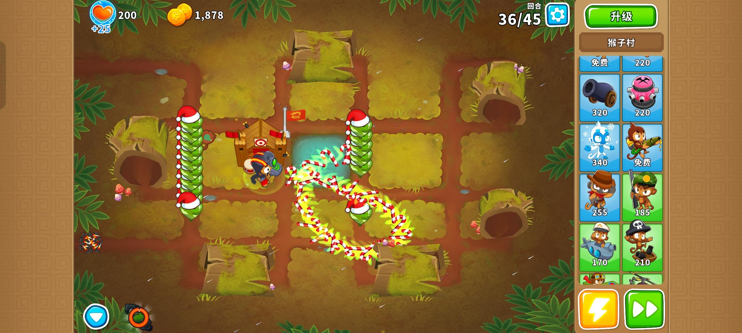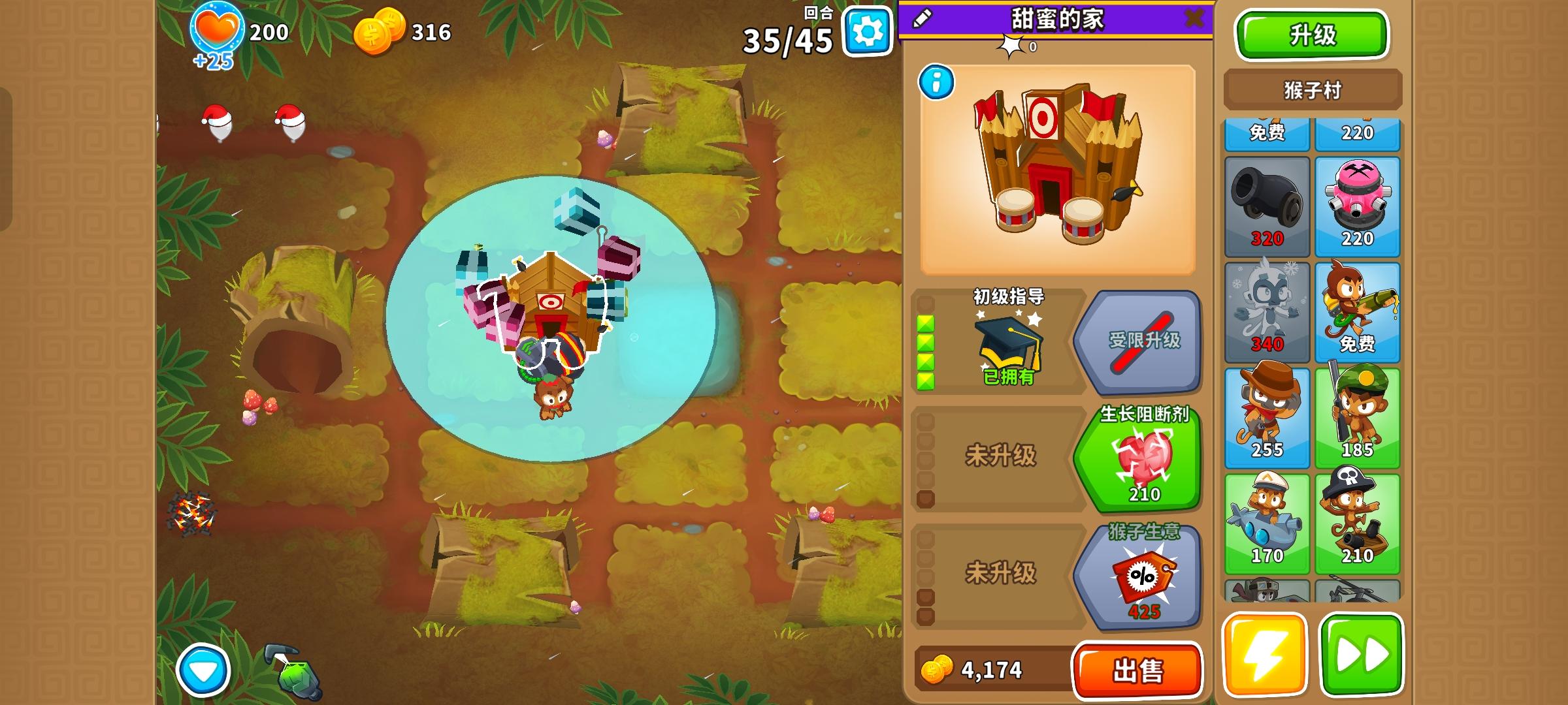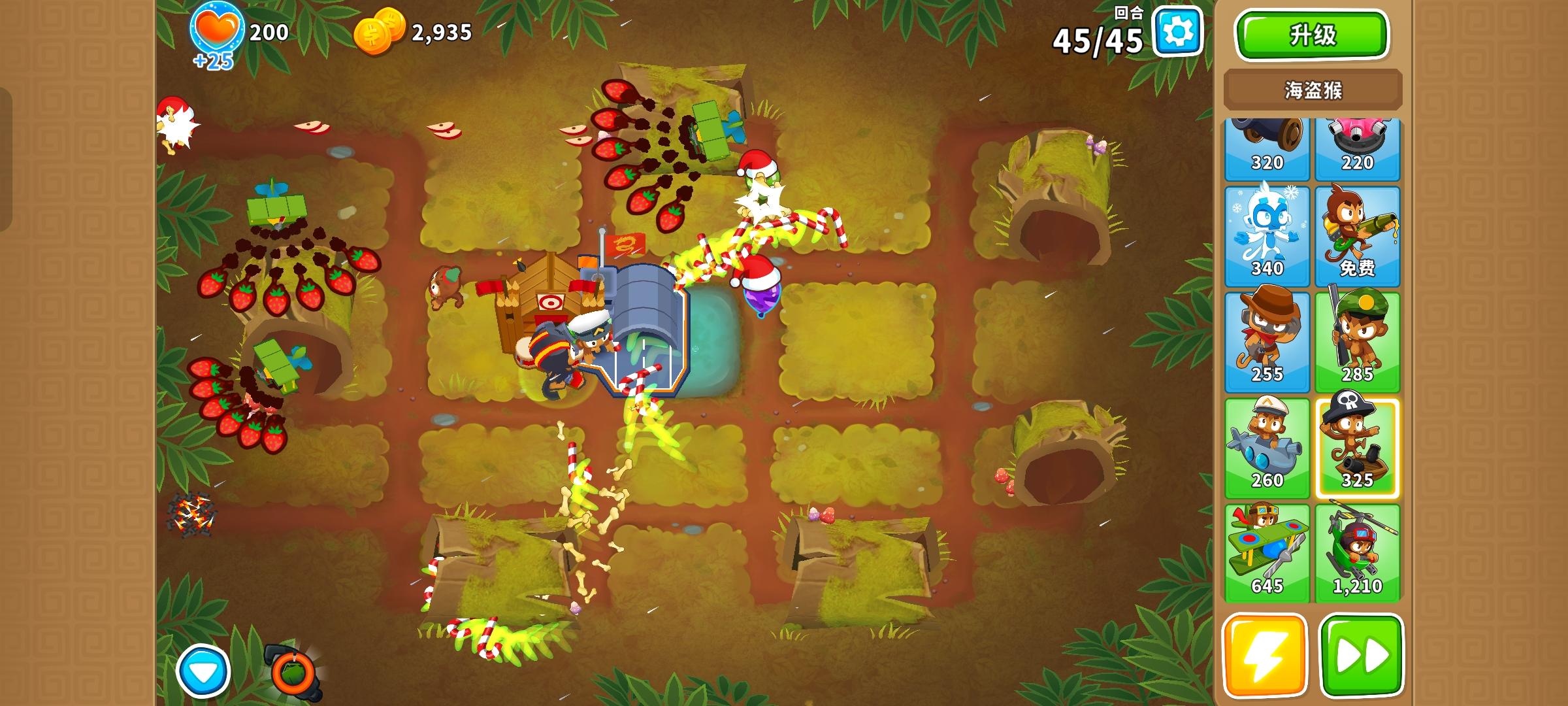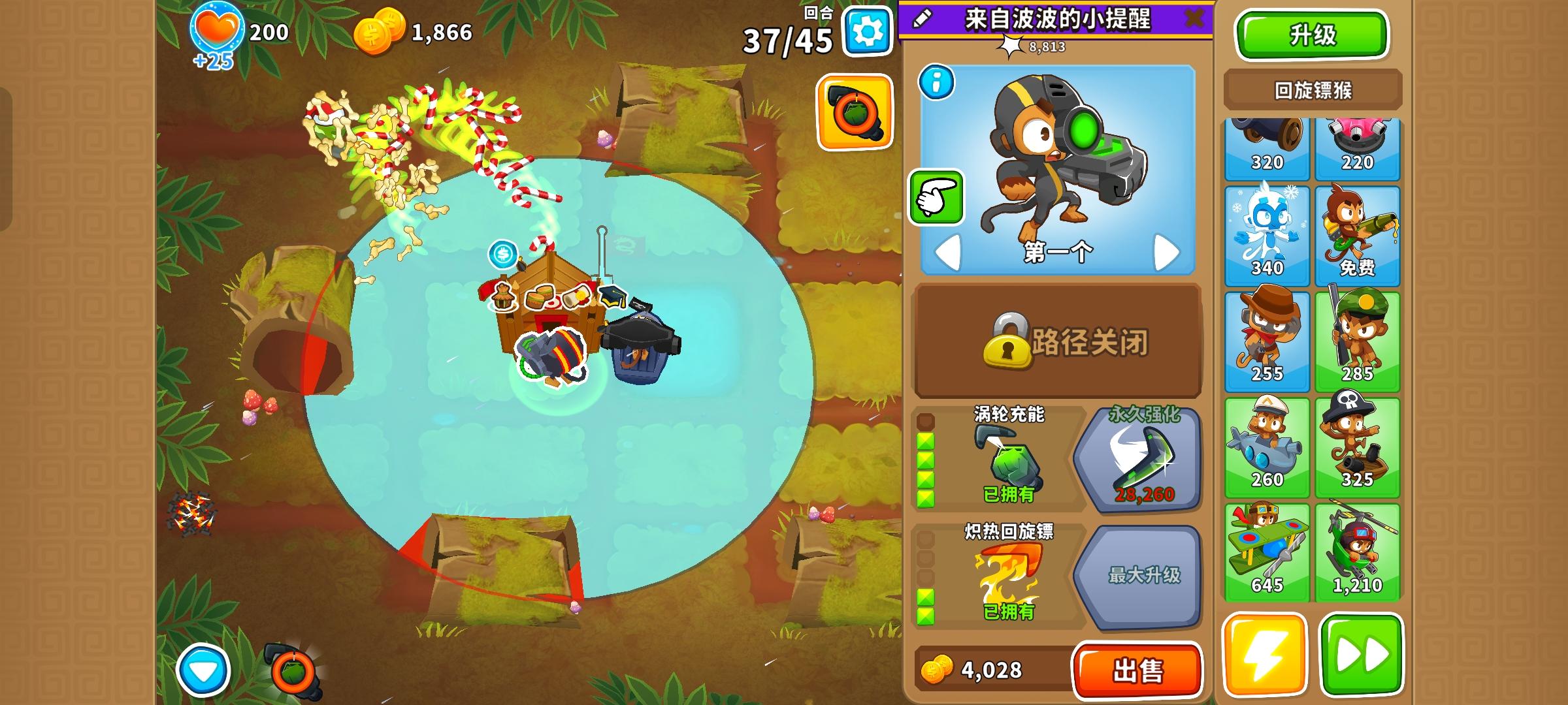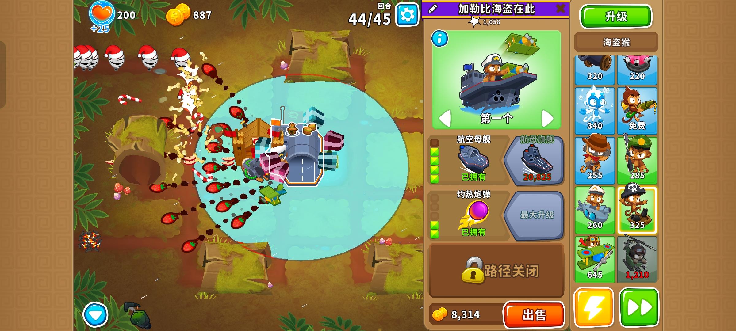 之后升级猴子村至400,减少回旋镖的技能冷却时间。有迷彩气球就开技能,你还可以用320甚至420海盗猴一起打输出,轻松通过!