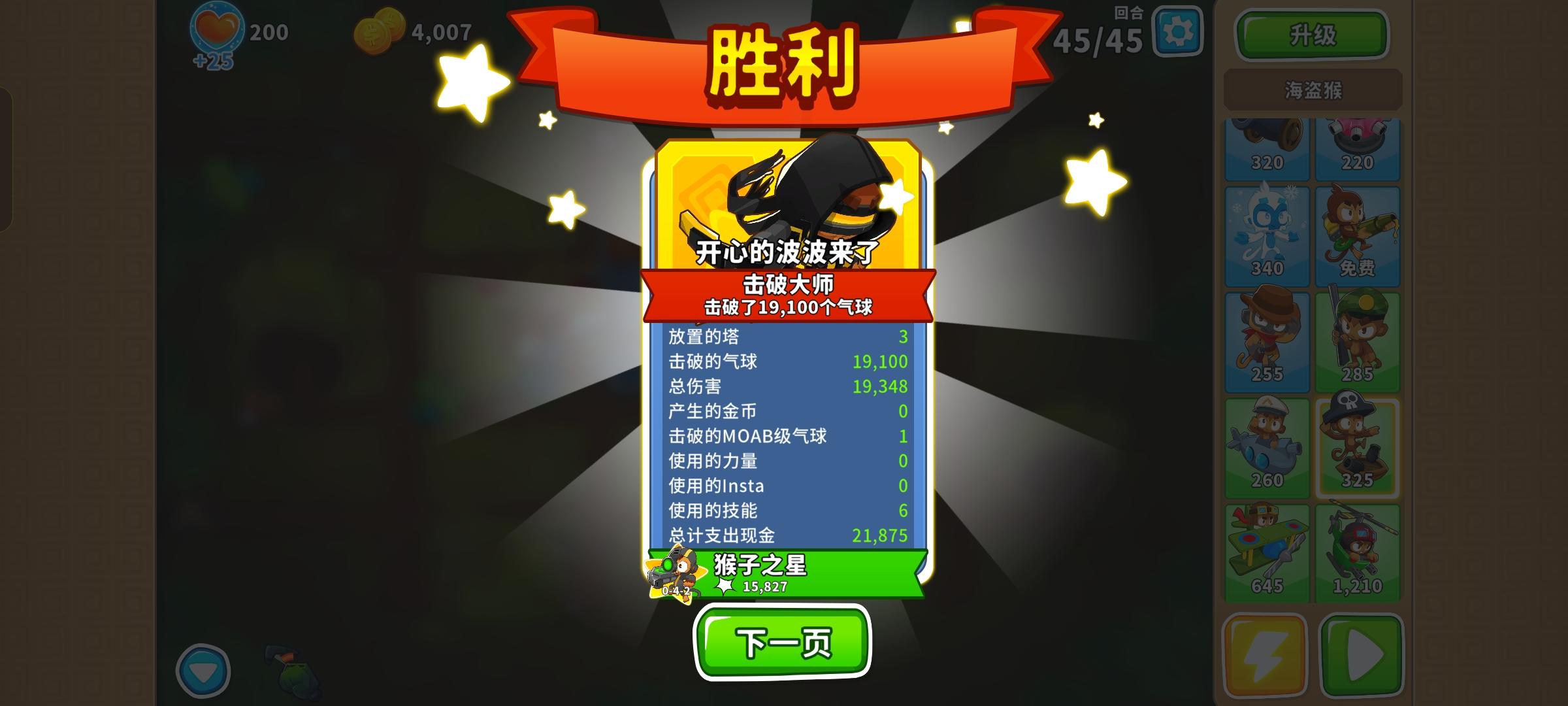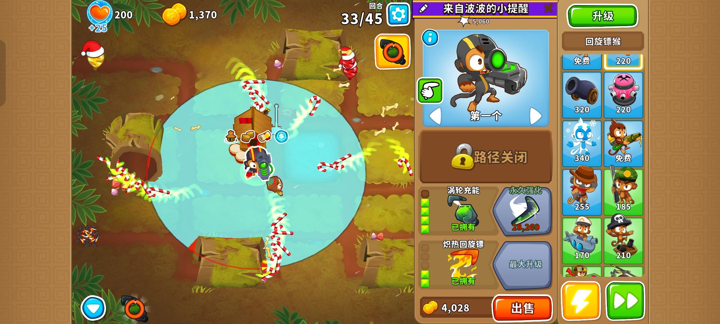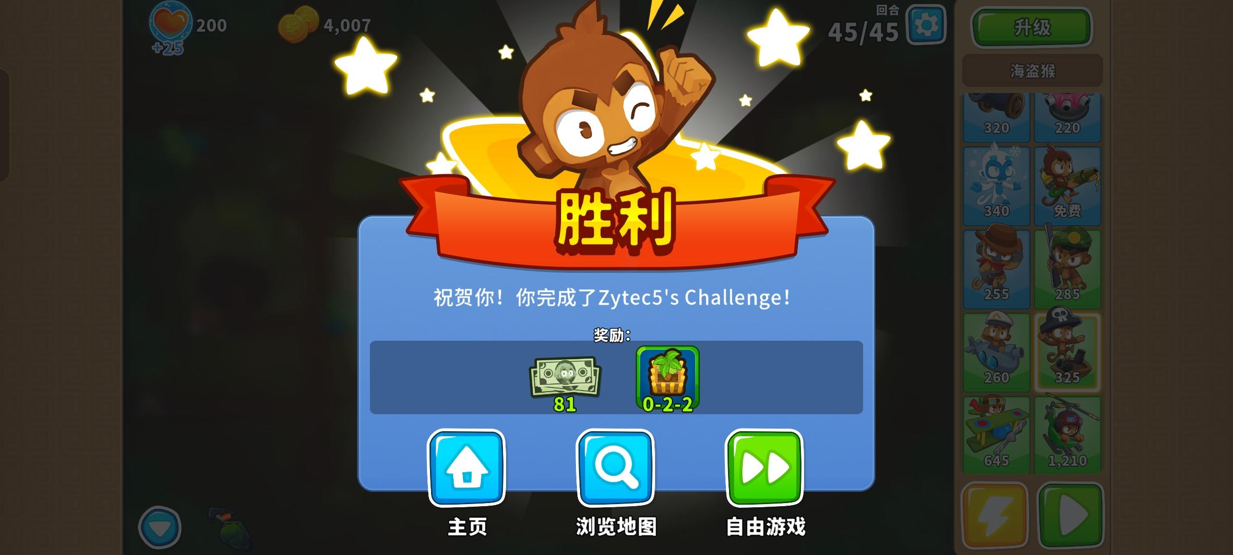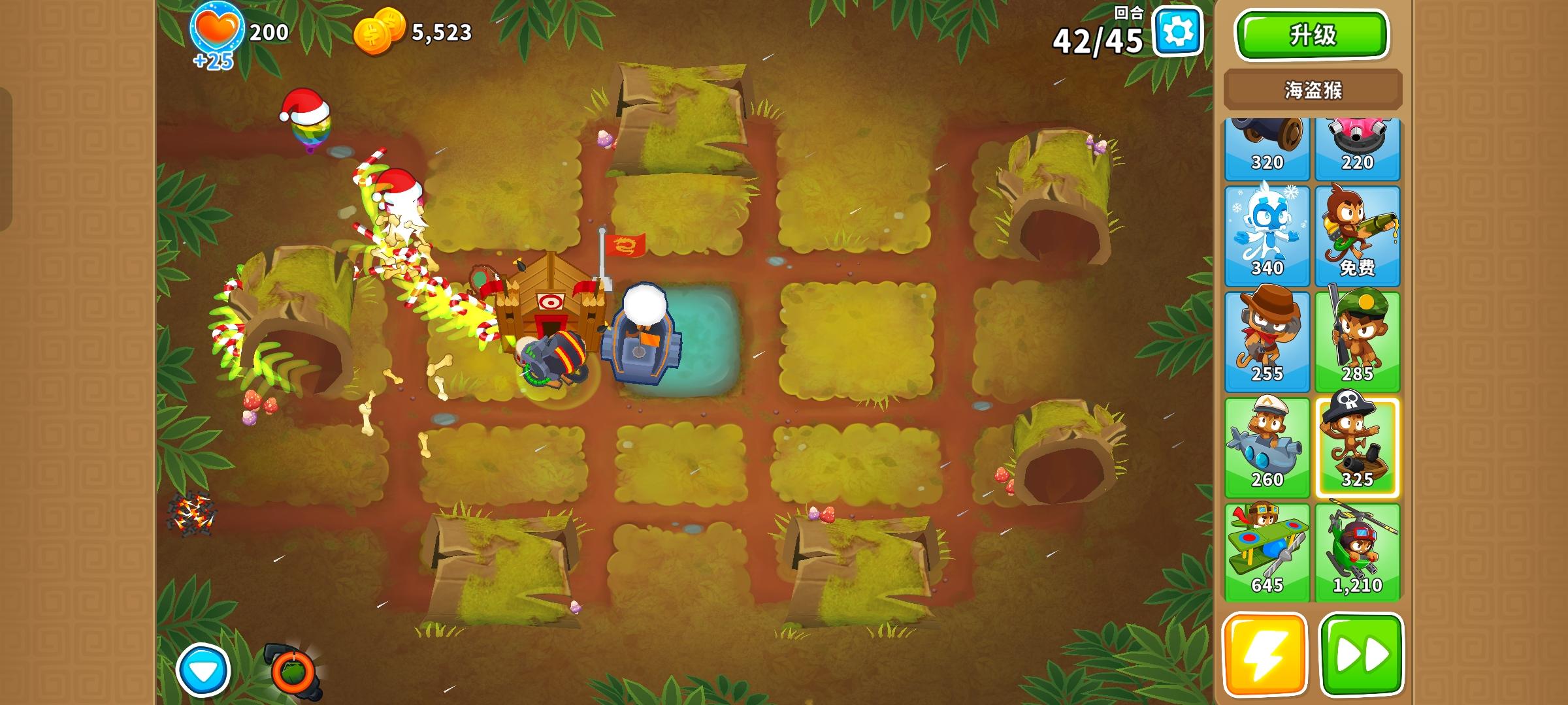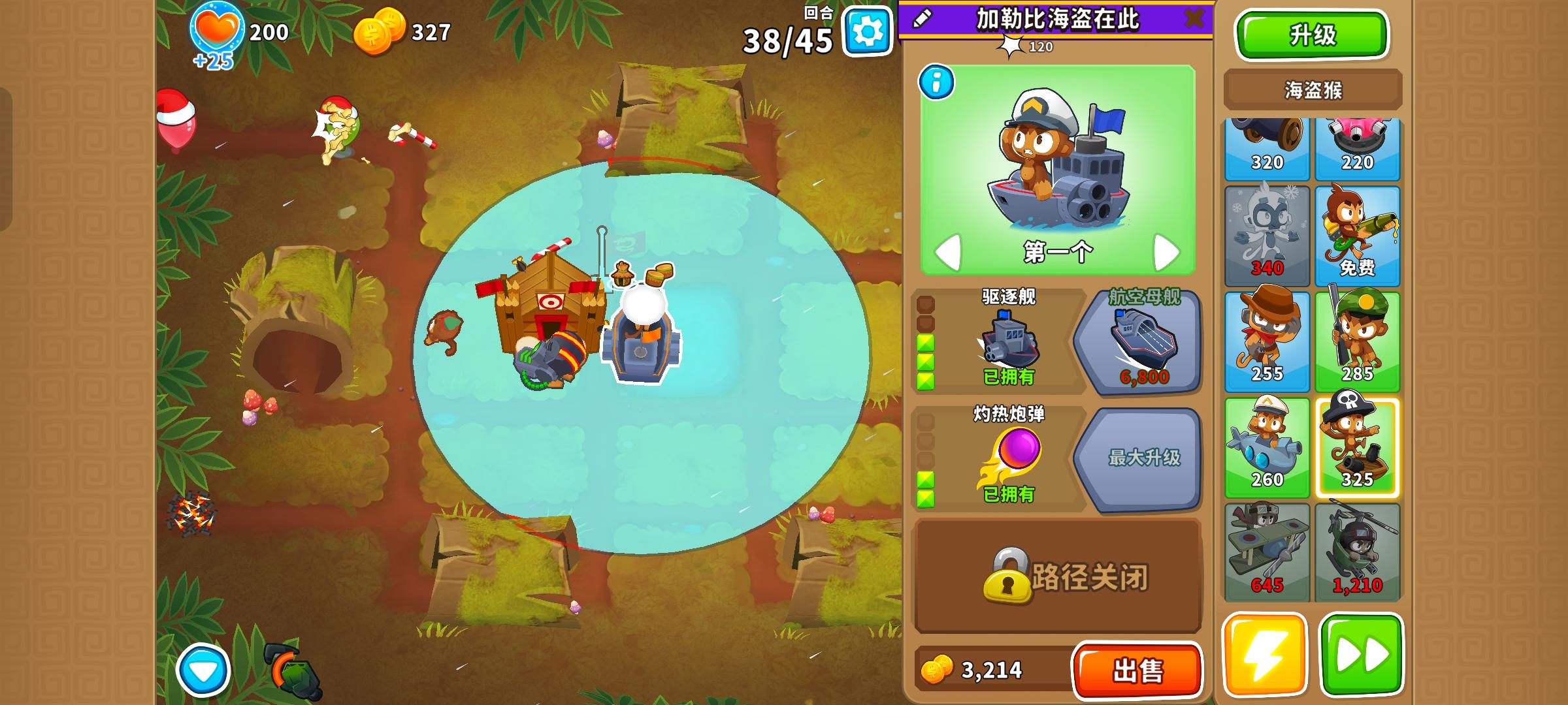 之后升级猴子村至400,减少回旋镖的技能冷却时间。有迷彩气球就开技能,你还可以用320甚至420海盗猴一起打输出,轻松通过!