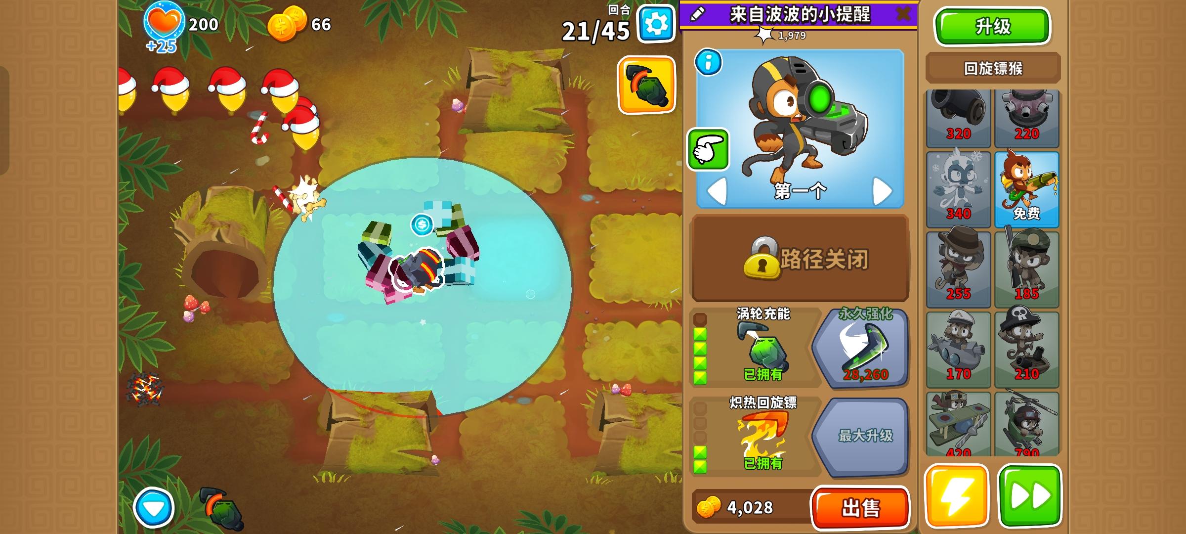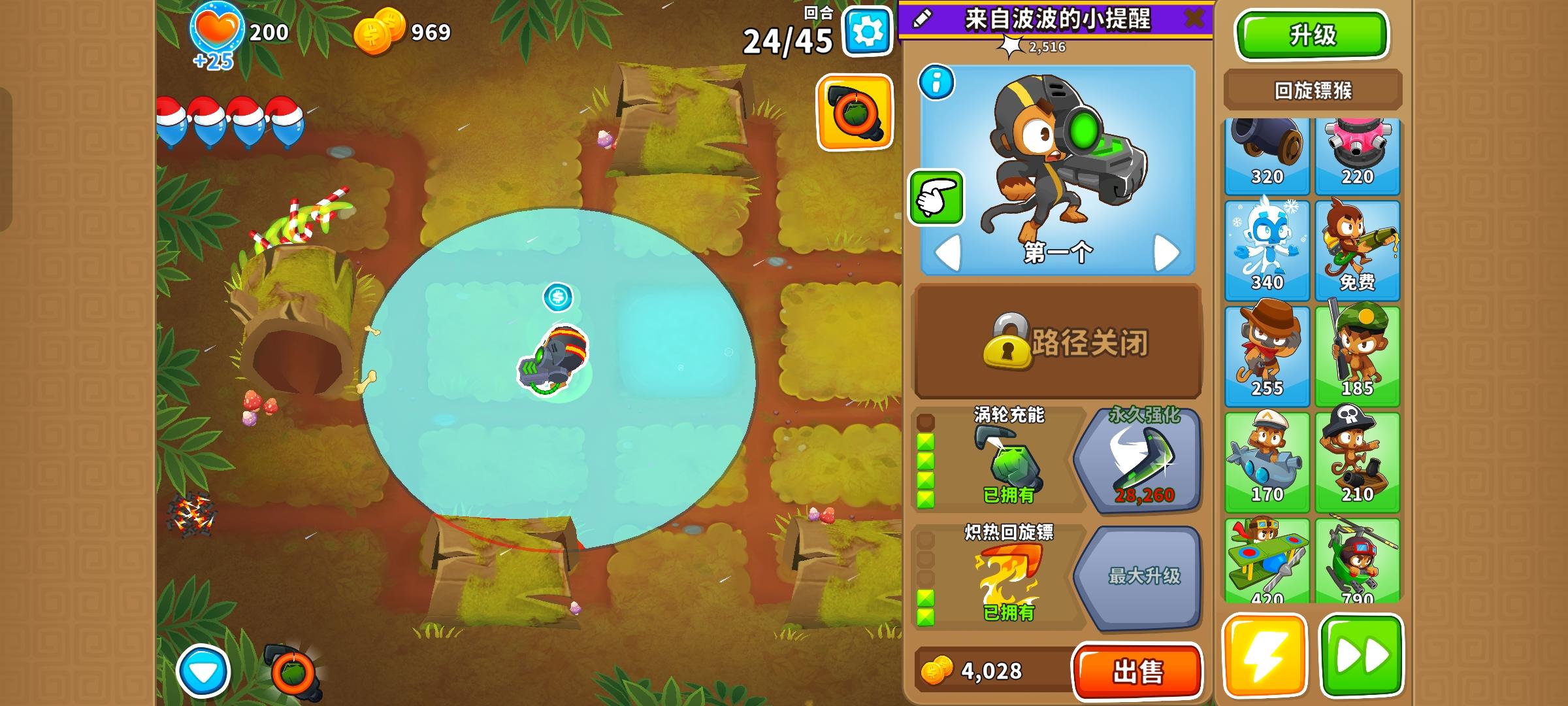 开局用022回旋镖,换手,钱够了就升级至032,最后快速升级至042,这样就能轻松打败24回合的第一个迷彩气球。