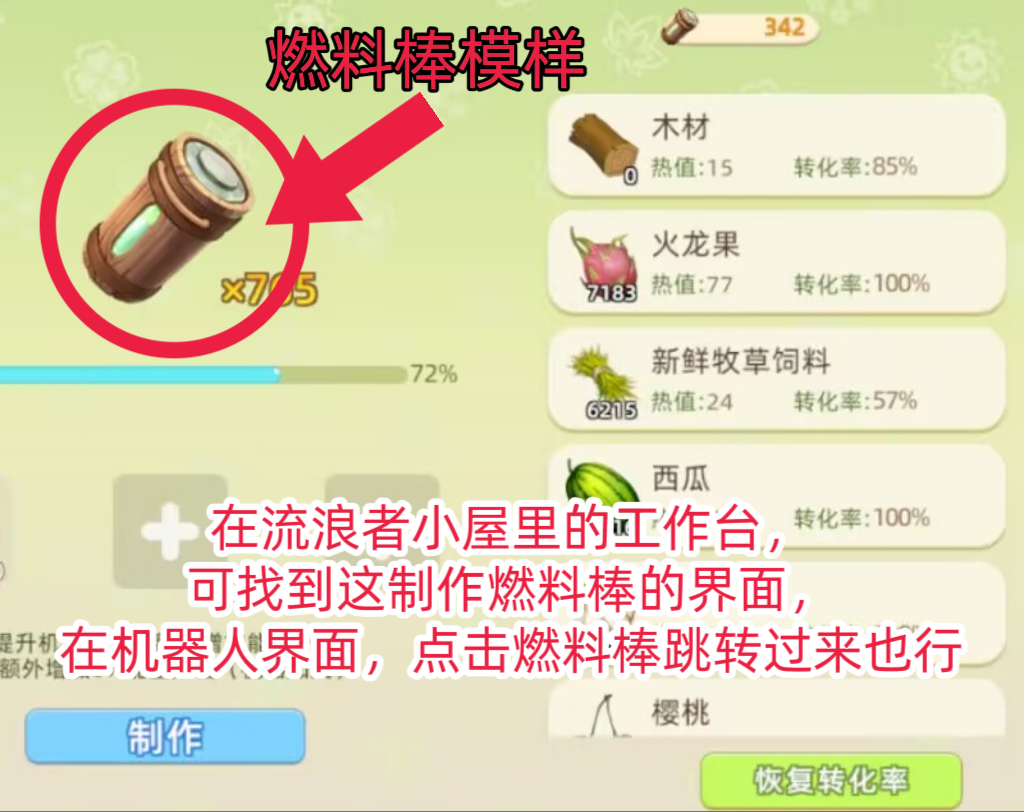 农作物得浇过水,它的成熟时间才会改变。燃料棒的制作,也可在机器人界面点击右上角的燃料棒图标进行跳转
