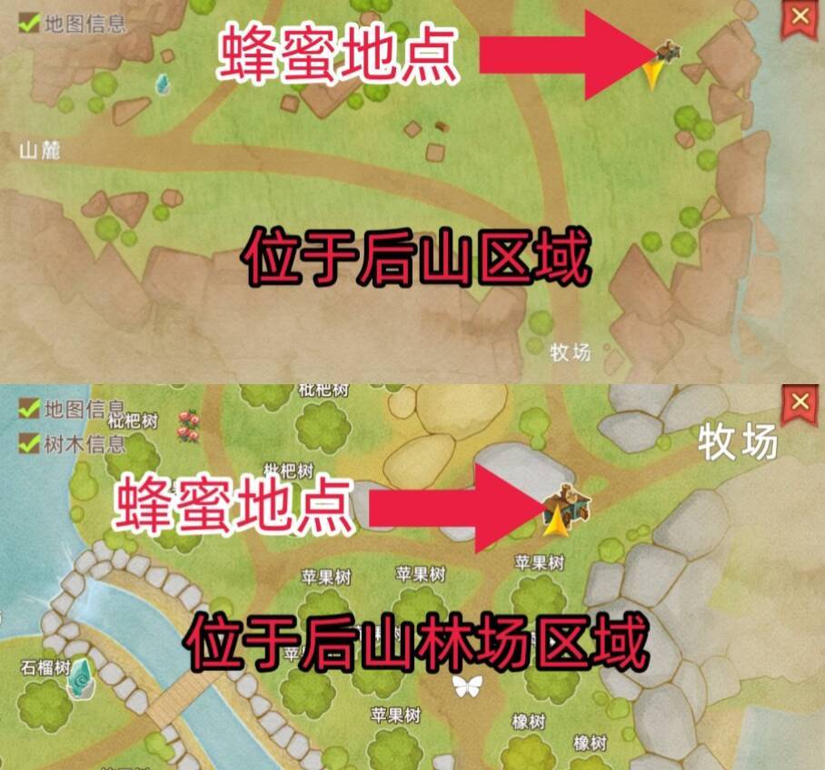 蜂蜜只有两个地点产出,你每天最多能得到两瓶!人物靠近蜂箱后,点击放大镜图标收获蜂蜜就好!