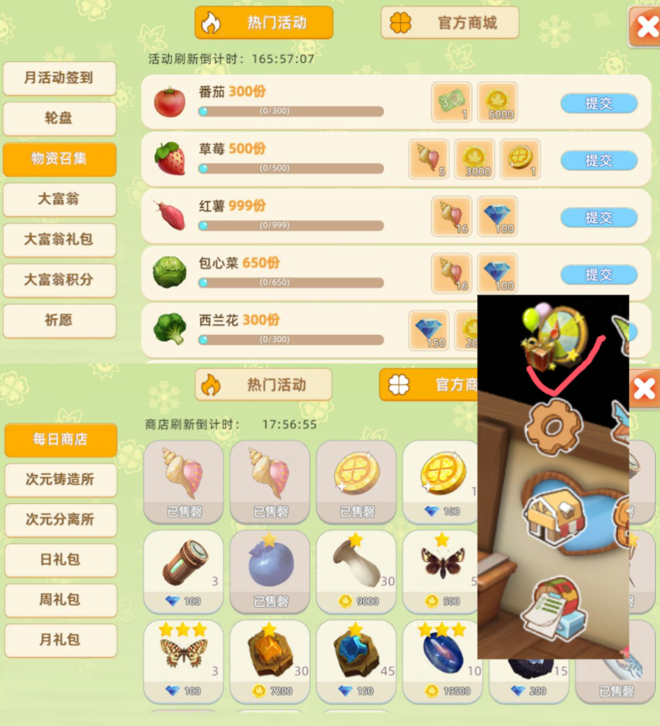 界面右上角打开这两界面,优先种物资召集的农作物赚奖励