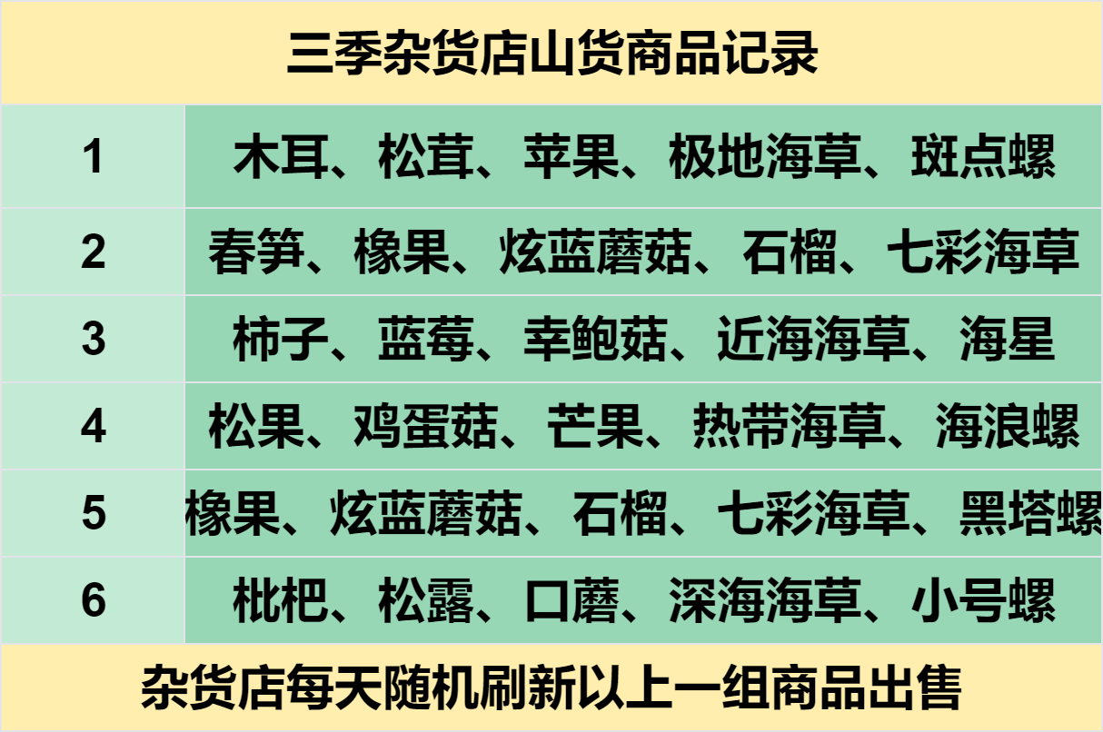 如果你缺一些稀有山货,例如松露、松茸、木耳这些物资,不妨每天看看桥头的杂货店,都是会有概率出售的哦!
