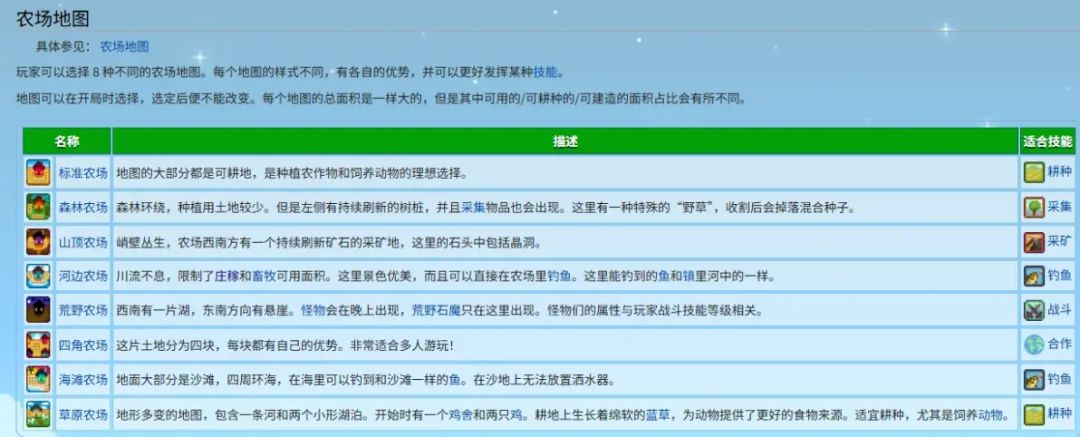 农场共有8种,如图所示,我个人比较喜欢标准农场(种地爽!)和海滩农场(好看但是不推荐新手,大部分土地无法安置洒水器)大家可以参考图中维基百科的介绍按需和喜好选择!