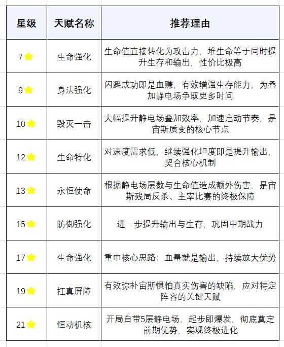 宙斯的天赋选择紧紧围绕其生命转化与静电场叠加的核心机制。优先保障生存(生命、闪避、防御),并加速静电场的启动与层数积累,遵循此思路,即可培养出一个后期无法解决的终极BOSS。