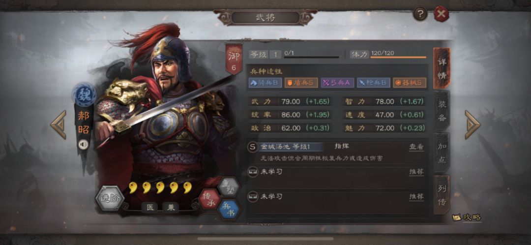 属性方面,郝昭的武统智无论是初始值还是成长值都属于中上水平,没有短板,是一个较为均衡的武将。战斗四维中唯一不足的就是其速度低于合格线,但因为郝昭的自带战法为指挥战法,所以速度慢这个缺陷对郝昭的影响不算很大。