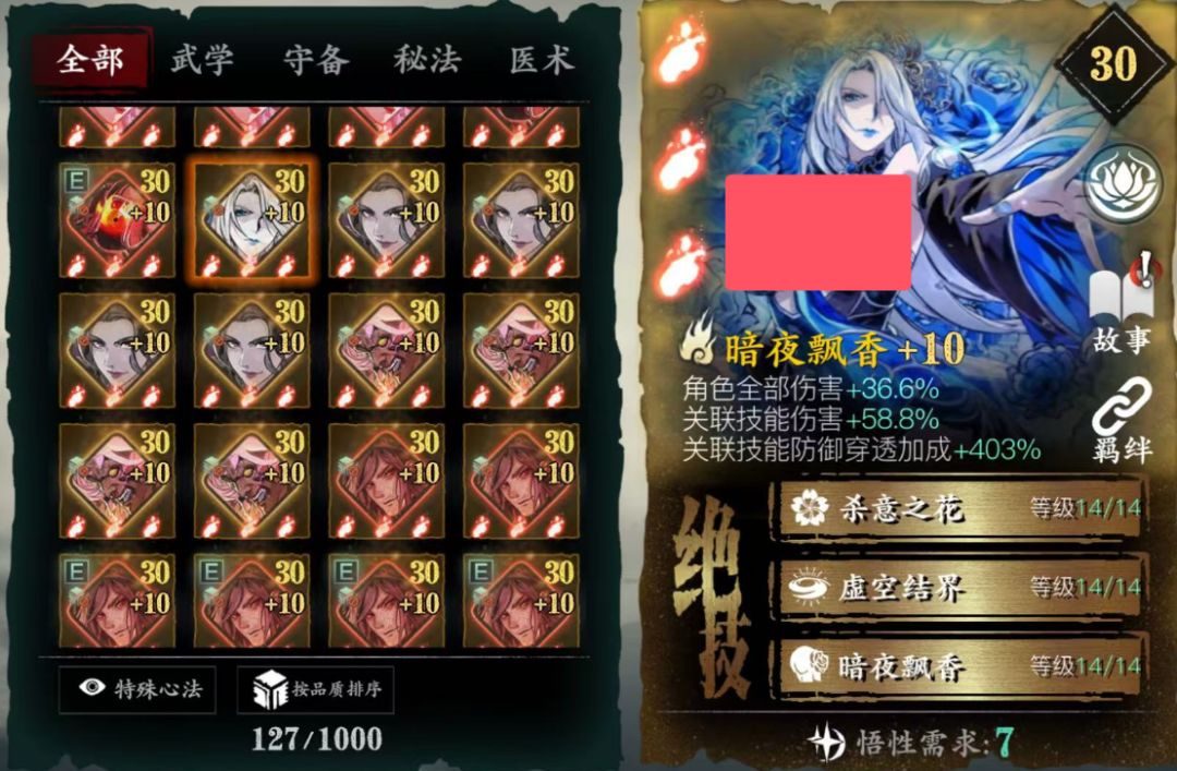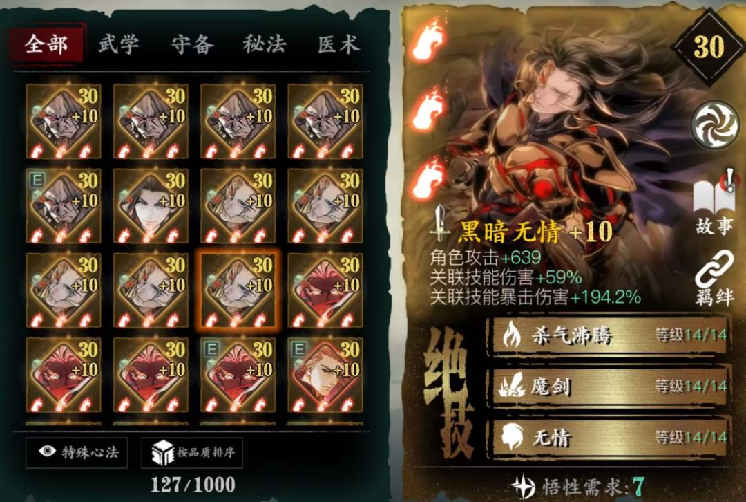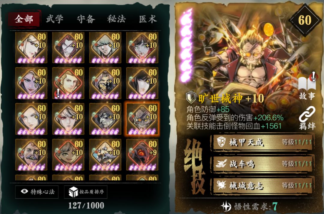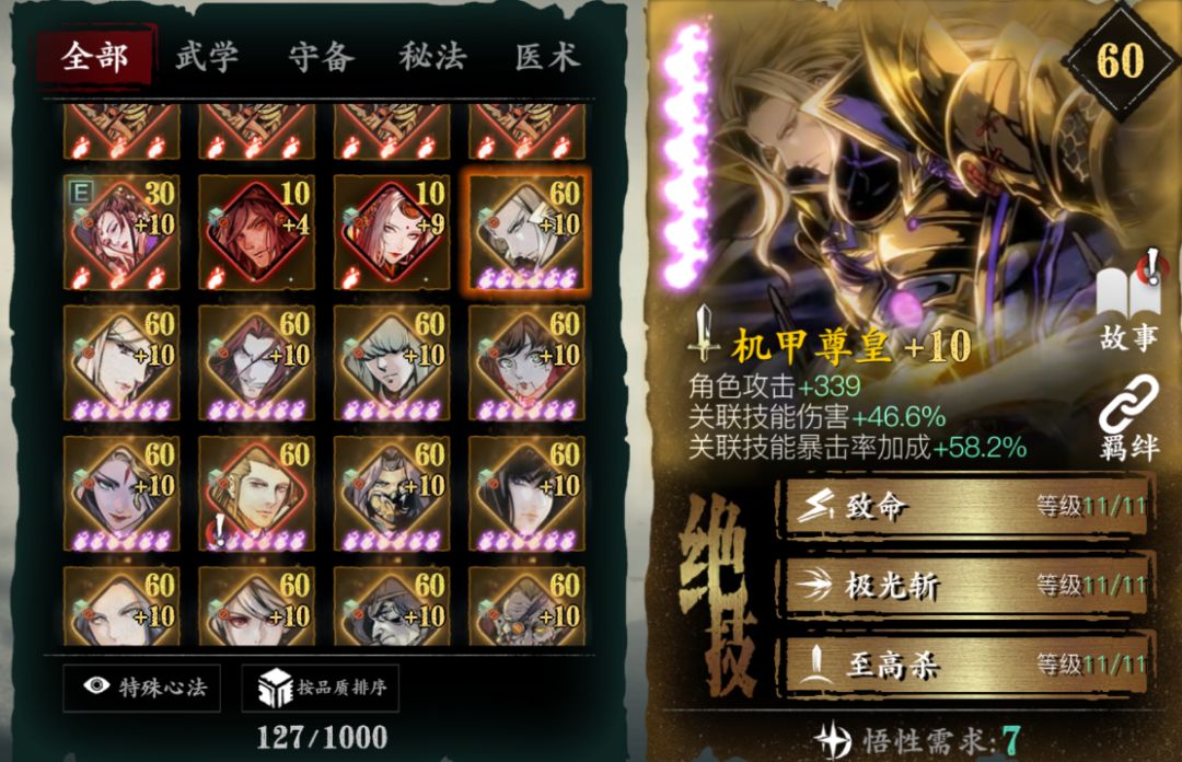 对于PVP提升非常大,人权必备卡,没有基本玩不了论剑,唯一一个心法无敌阵法,心法越高无敌时间越长,不用解释