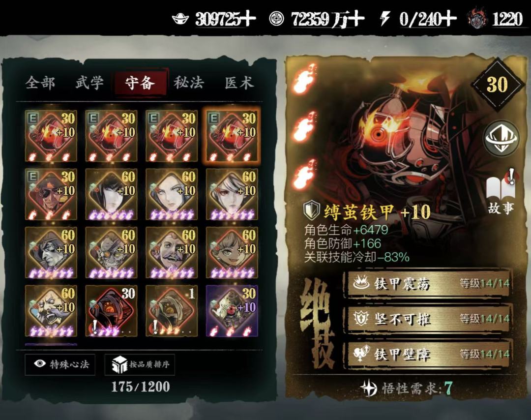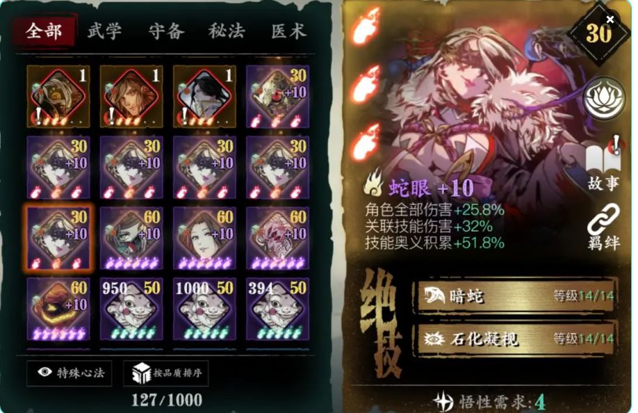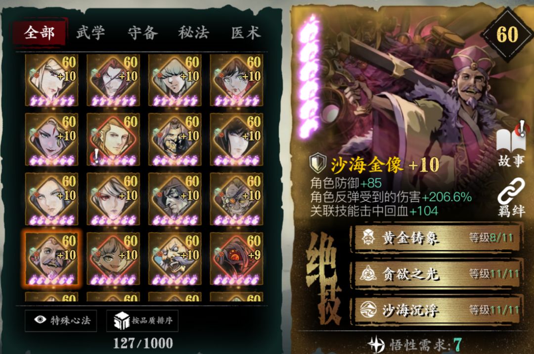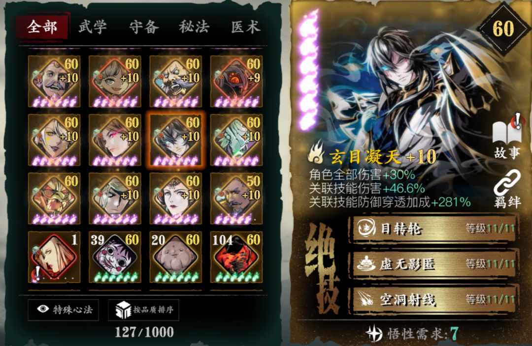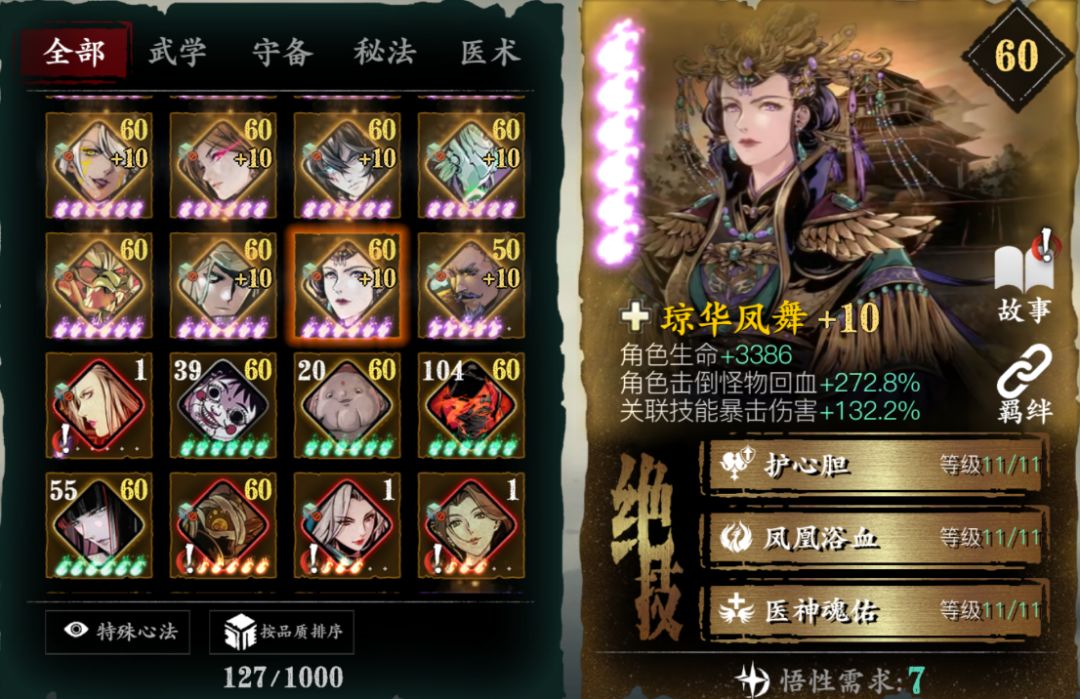 对于PVP提升非常大,人权必备卡,没有基本玩不了论剑,唯一一个心法无敌阵法,心法越高无敌时间越长,不用解释