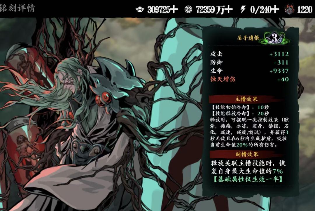 对于PVP提升非常大,此卡基本可以称为论剑的人权卡,拥有全心法唯一的硬控,同时有减少眩晕、控制的绝技是必需卡,同时铭刻效果也不弱,拥有全屏眩晕,如果蚀灭高伤害也比较可观。