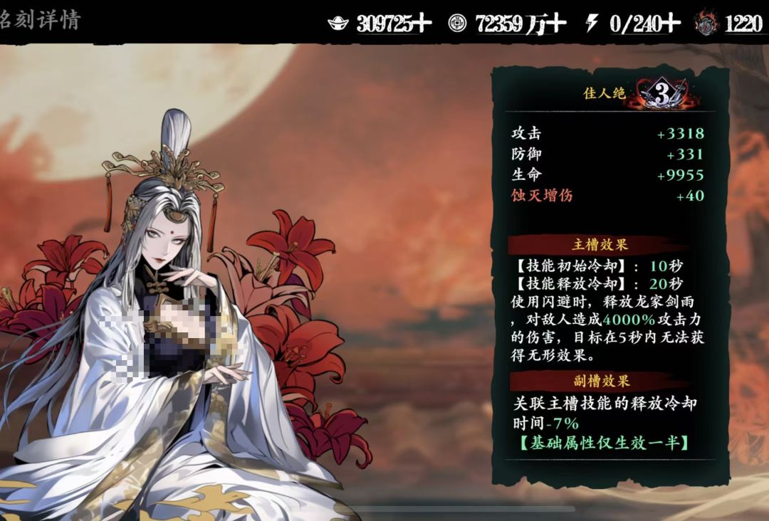 对于新玩家提升非常大,无论绝技还是铭刻定位都是人权卡,有减CD、有绝技2加伤、有铸魂、有神情免疫伤害、有暴击率可以说是新手必抽的一张卡;