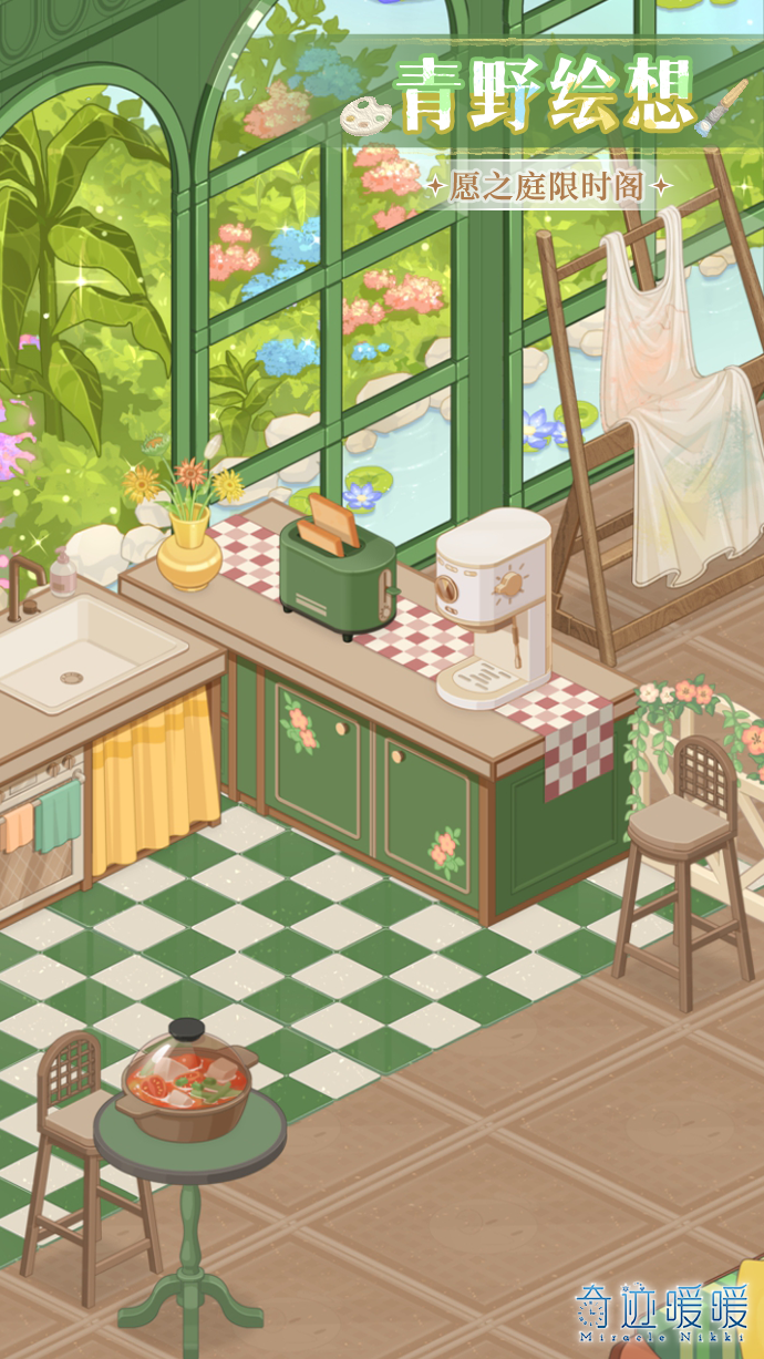 10月6日5:00—10月12日23:59,在小屋愿之庭的限时抽奖阁“青野绘想”许愿,可获得玻璃花房主题家具!集齐所有限定家具还可领取全新小暖暖装扮“纯臻花韵”!