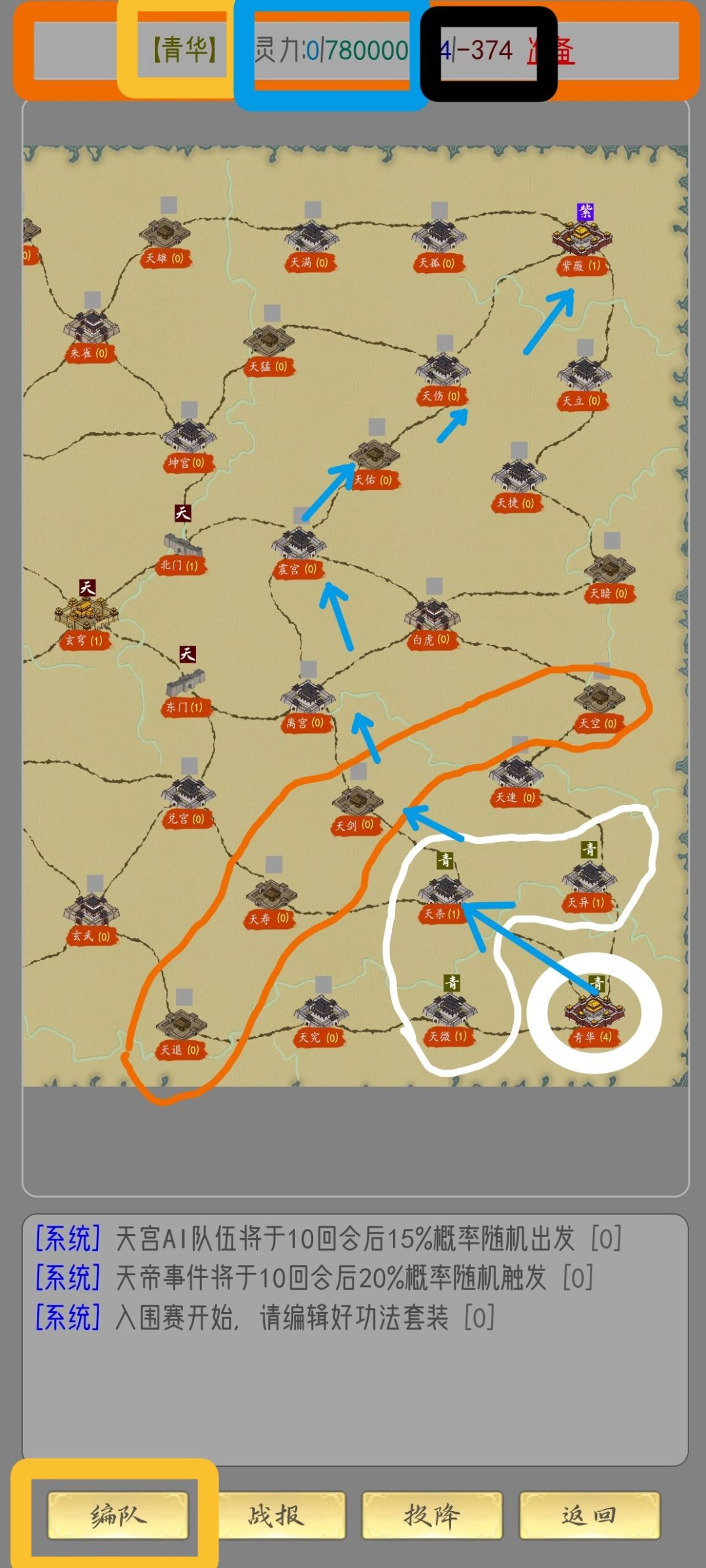 【青华】代表这你这局所代表的势力,一共有四家(勾陈,紫薇,长生,青华),同时还能点击进去【签临时合约】