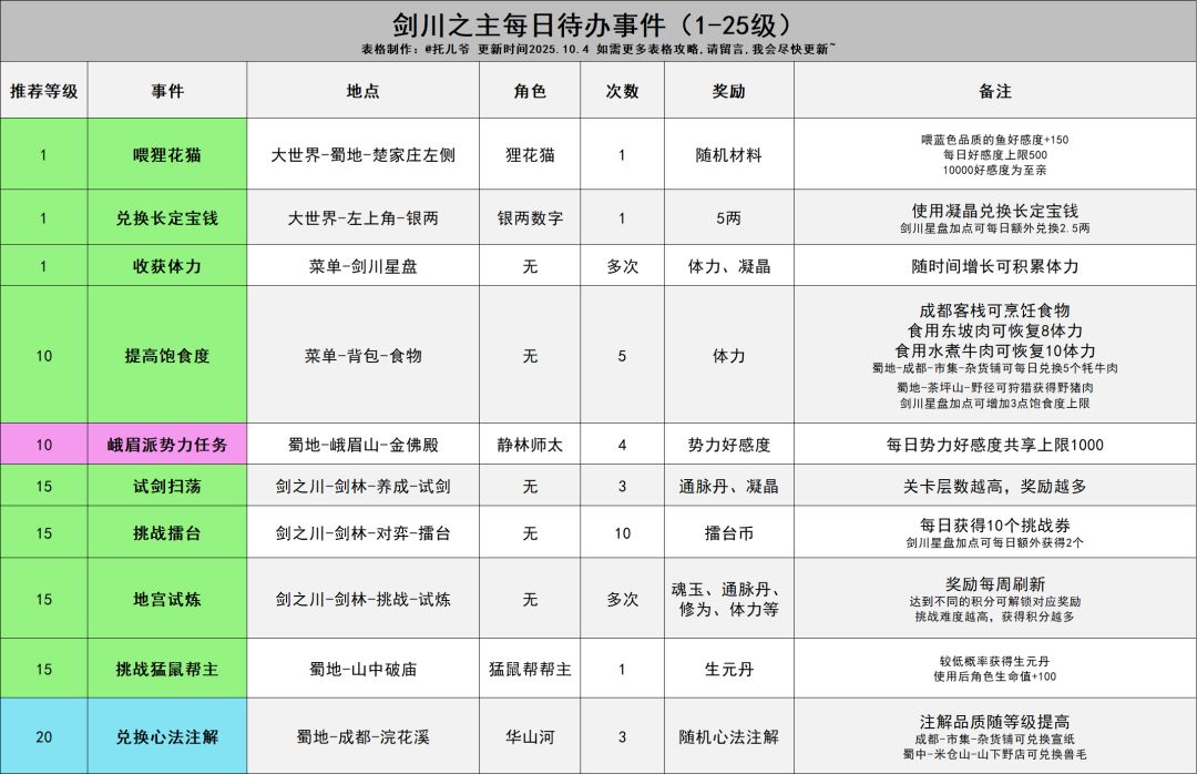 最近等级越来越高了,要做的事情越来越多,所以索性整理了个表格出来,每天对照着,别落下东西了。