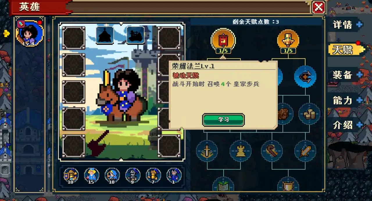 游戏中的英雄每到达一定等级就会获得天赋点数,其中天赋点数可以学习各种强力的天赋。在游戏中的堡垒处,玩家们还可以招募英雄士兵,并且还可以为英雄配备士兵以及军队等。当在游戏中遇到其他势力的敌人或者野怪时,就可以展开战斗,游戏的战斗系统采用了放置玩法,玩家们只需要将军队部署在地图上,就可以观看这一场战斗,玩家们也可以在对战过程中指挥英雄释放技能,但如果你觉得这场战斗打的并不符合自己的意愿的时候,就可以选择重新挑战,在战斗开始,系统还会将玩家实力与对方实力做出评估,当战力差距悬殊时,还可以选择避战。