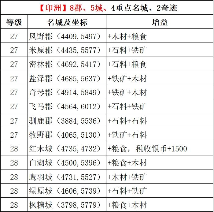 其中印洲共有17座名城和2个奇迹,名城虽然不多,但是等级最低的都是郡,没有镇这样的名城,名城分为五个级别:镇(26级)、郡(27级)、城(28级),都/港/塔/(30级),还有最高级别的(35级)。