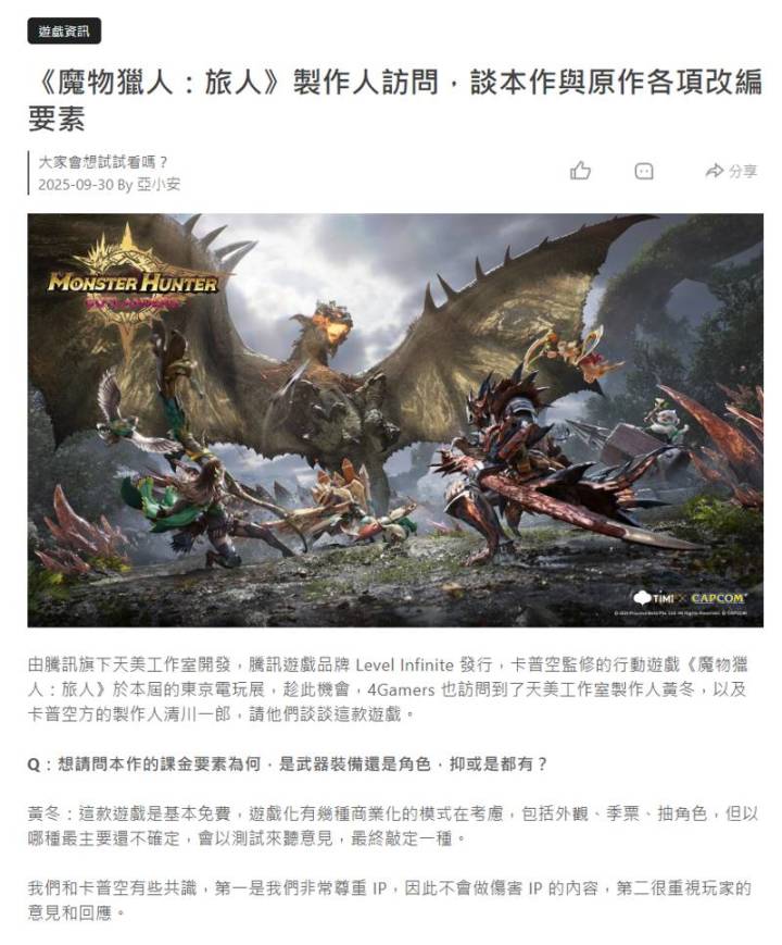 由腾讯旗下天美工作室开发,腾讯游戏品牌 Level Infinite 发行,卡普空监修的手机游戏《怪物猎人:旅人》于本届东京电玩展亮相。借此机会,4Gamers 访问到了天美工作室制作人黄冬,以及卡普空方的制作人清川一郎,请他们谈谈这款游戏。