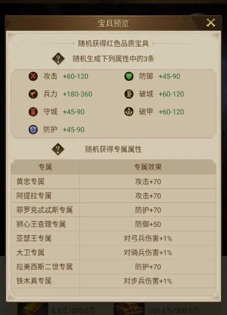 专属属性:指定英雄佩戴方可生效,目前主要是加攻击、防御、防护、对指定兵种伤害加成。