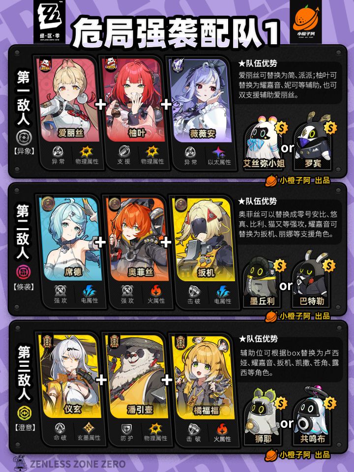 这一期危局强袭战又迎来了BOSS【秽息妖鬼·名可名】,敌人每次进入属性异常,代理人对其造成的异常伤害提升,外加上物理与以太弱点,首推异常队伍爱丽丝+柚叶+薇薇安,没有柚叶可用耀嘉音来代替,没有爱丽丝可用简来代替,甚至派派也可一战,爱丽丝与简都有也可组成爱丽丝+简+柚叶配队。