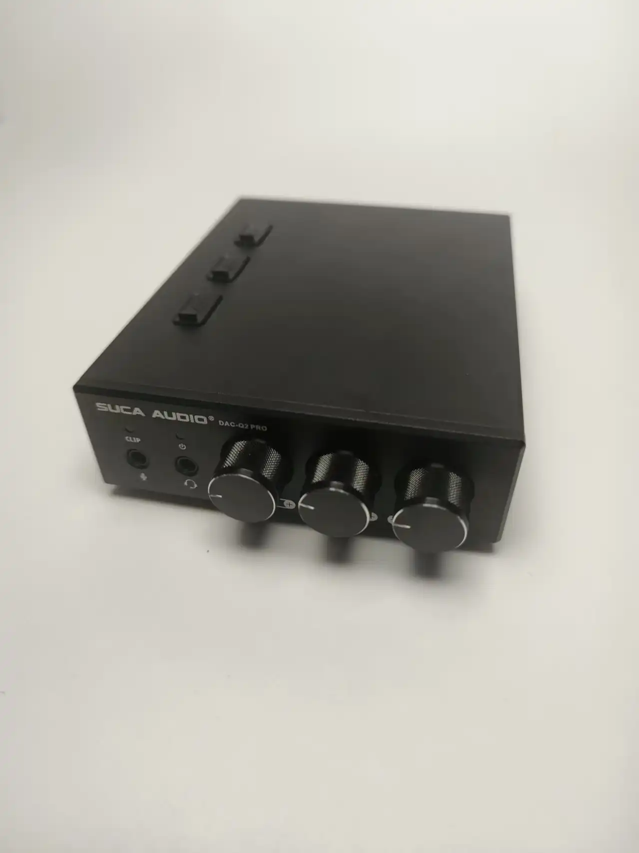 除此之外,这款耳放还搭载了三个旋钮以及三个USB接口,其中旋钮的作用我在后面单独聊一下其实单纯体积就能看出,这款耳放要比那些便携式耳放性能要优秀,由于大体积可以容纳更多东西,这款耳放特意搭载了高端ES9039解码芯片,这种芯片具有高解吸力和纯净的音色,由于是光纤接口,因此还兼具低延迟的特点,非常适合游戏党使用。
