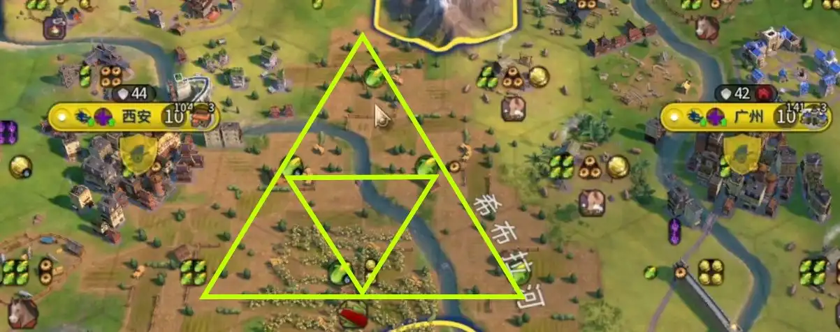 大三角田可以让每个田受到周围田地的影响大幅增加粮食产量同时给两个城市提供足够的住房。