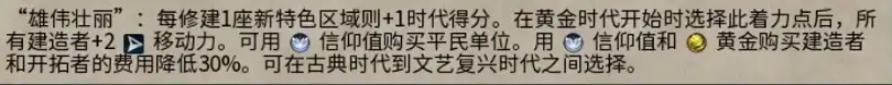 根据科技情况,抉择雨林区域雨林需要铸铜才能建造区域,但是雨林可以提供大量粮食以上事情做完还有时间可以去建造商人开商路,同时也可以让单位走的更快古典时代进入黄金时代,着力点选择:雄伟壮丽。