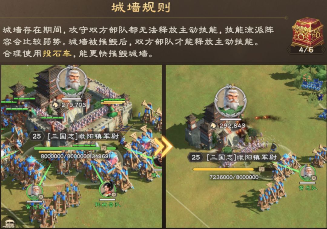 主公们要注意,进攻对面建筑物时,建筑存在城墙时,城墙存在时,攻守方都无法使用技能。因此,这里推荐的队伍尽量不要使用很依赖技能的队伍。