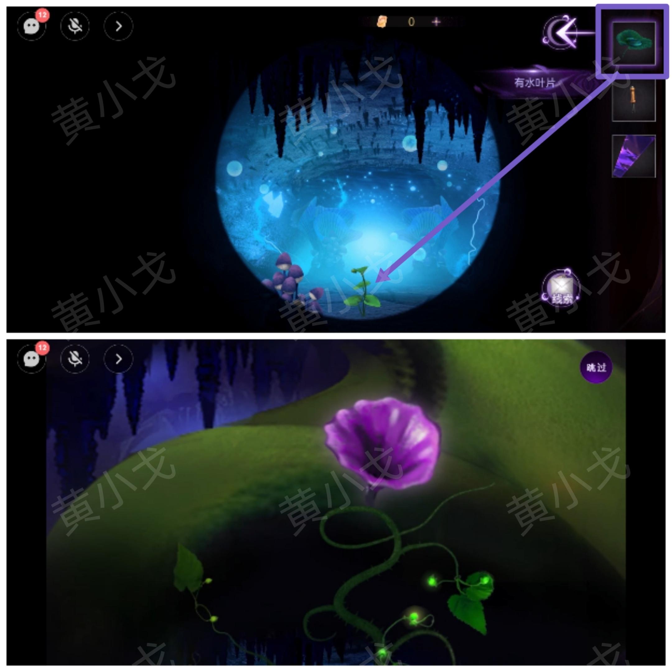 3.队友点亮山洞后进入山洞。先叫队友切换到左侧,拾取地上的【有水叶片】
