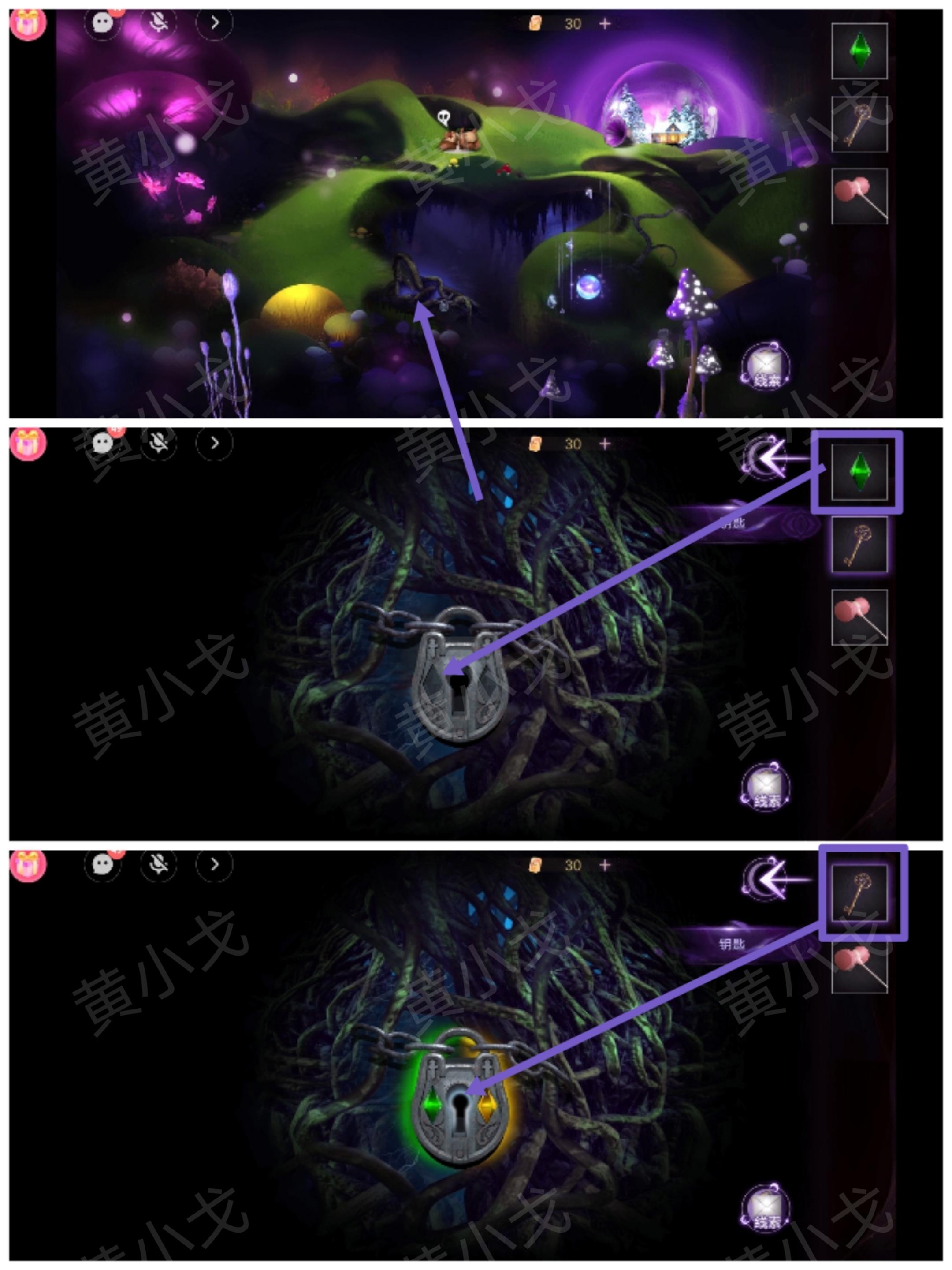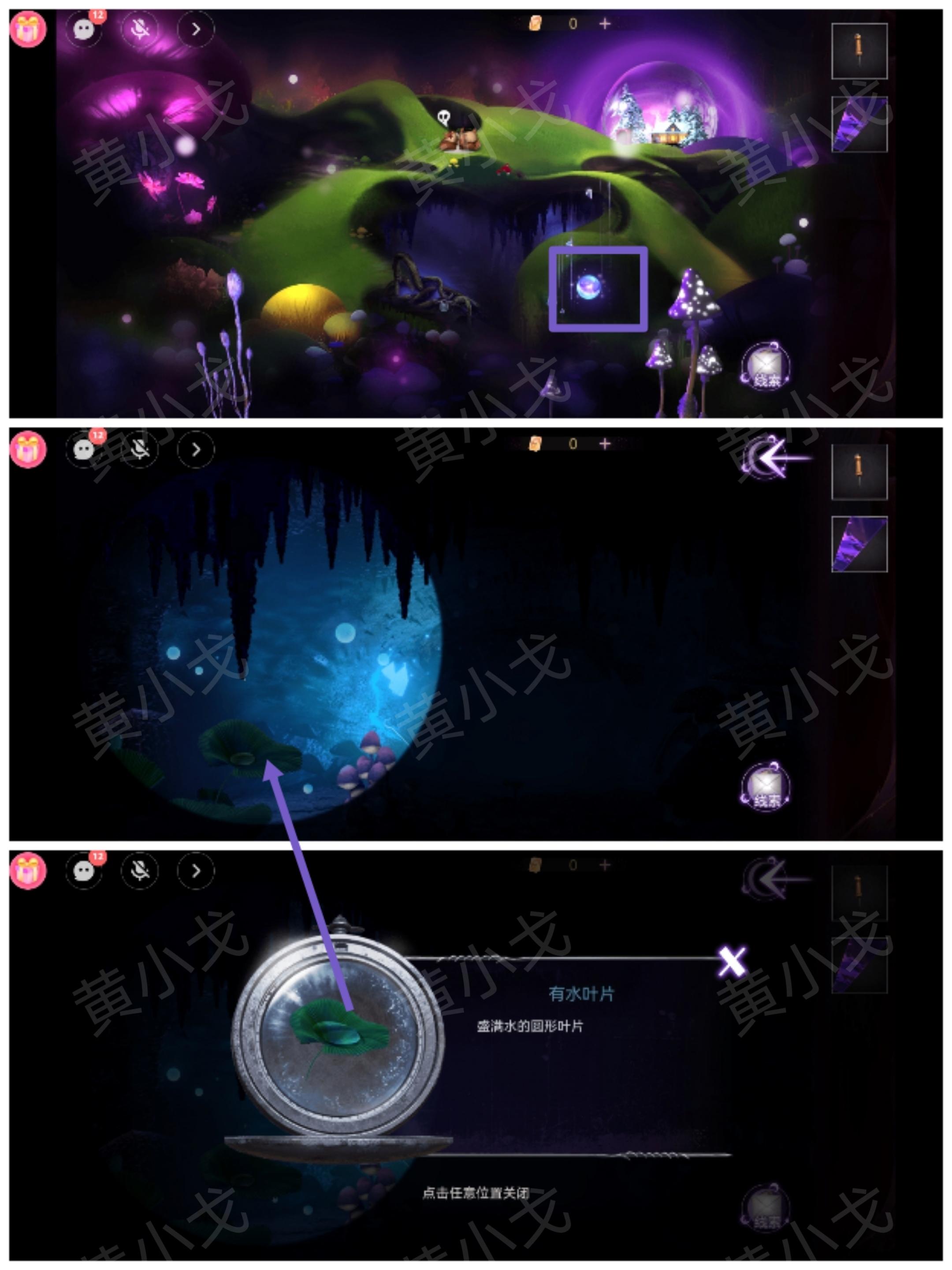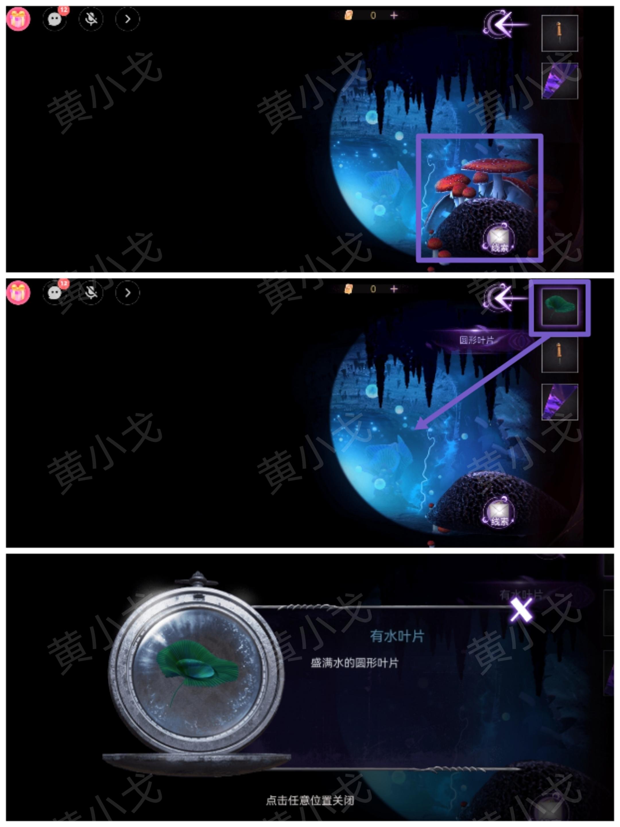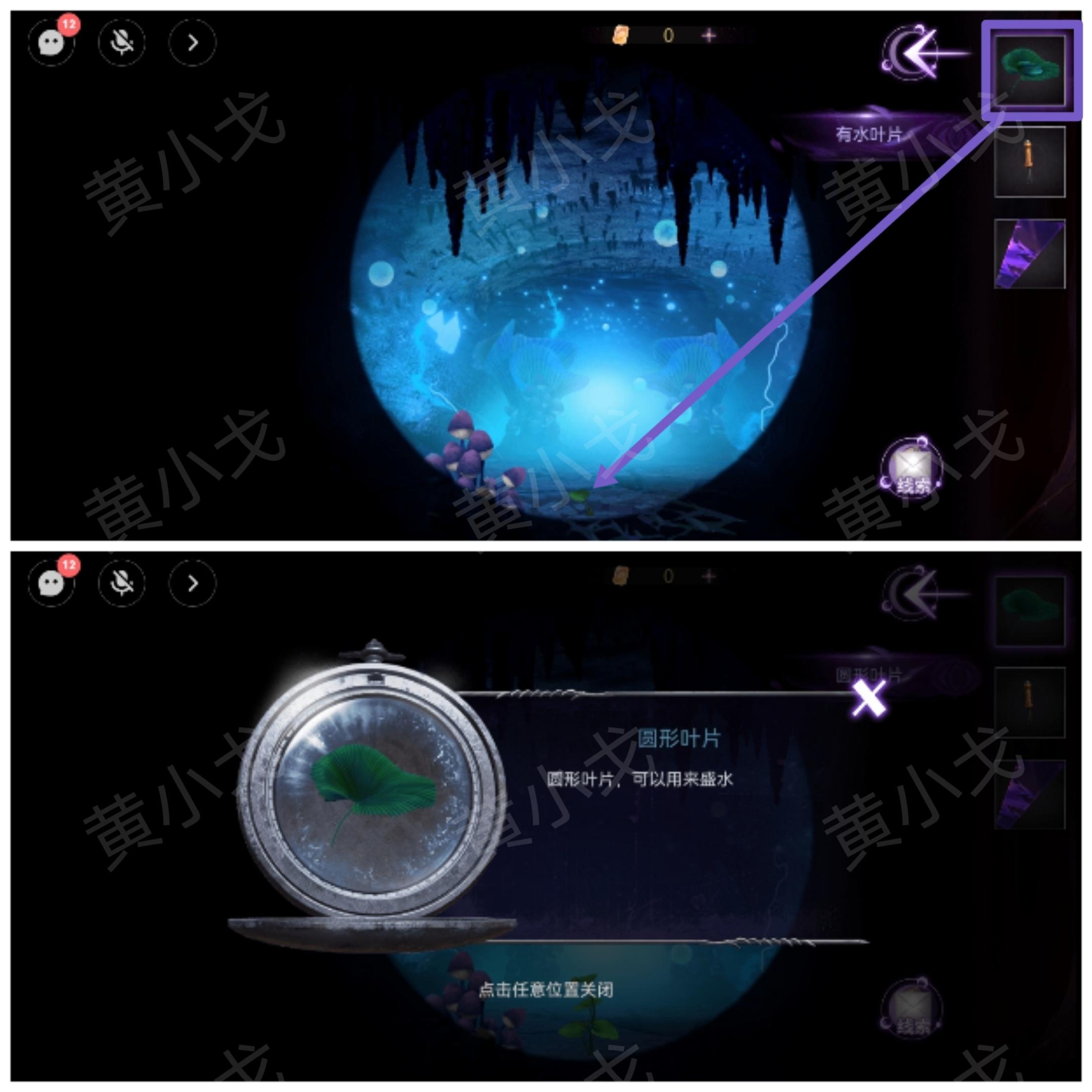 5.叫队友切换到右侧,拿开蘑菇,用【圆形叶片】接水滴,获得【有水叶片】