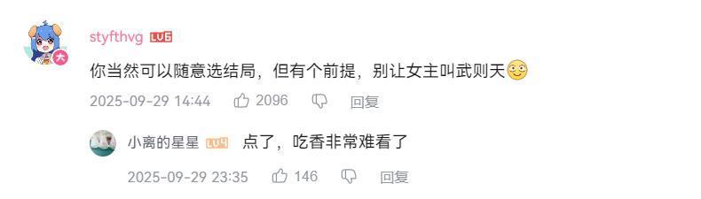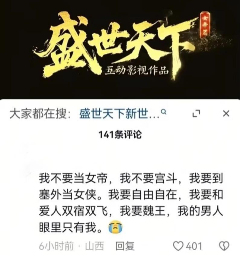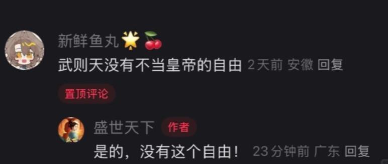 一个是意见最大的历史向玩家。《盛世天下》的宣发感觉热度最大一点就是“武则天称帝”,营销“大女主”。毕竟橙光原版就是武皇,也是个为了皇帝权利孤家寡人的版本,所以也不能说错。