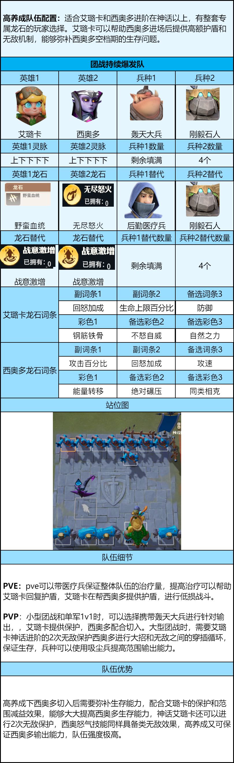 点法:上下下下下重点强化艾璐卡的前排输出保护能力,提高前排战场减益效果和前排英雄护盾效果。