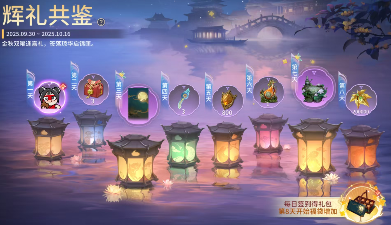 中秋限时活动【辉礼共鉴】自9月30日起至10月6日,每日登录签到,就能领【月饼福袋】,从第8天开始,福袋数量直接翻倍!