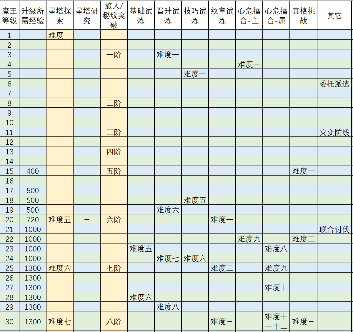 - 已用黄色标明,11、14、15、20、21、25、31都是补正属性跨度比较大的纪录评级,条件允许的话还是追求突破这些评级吧