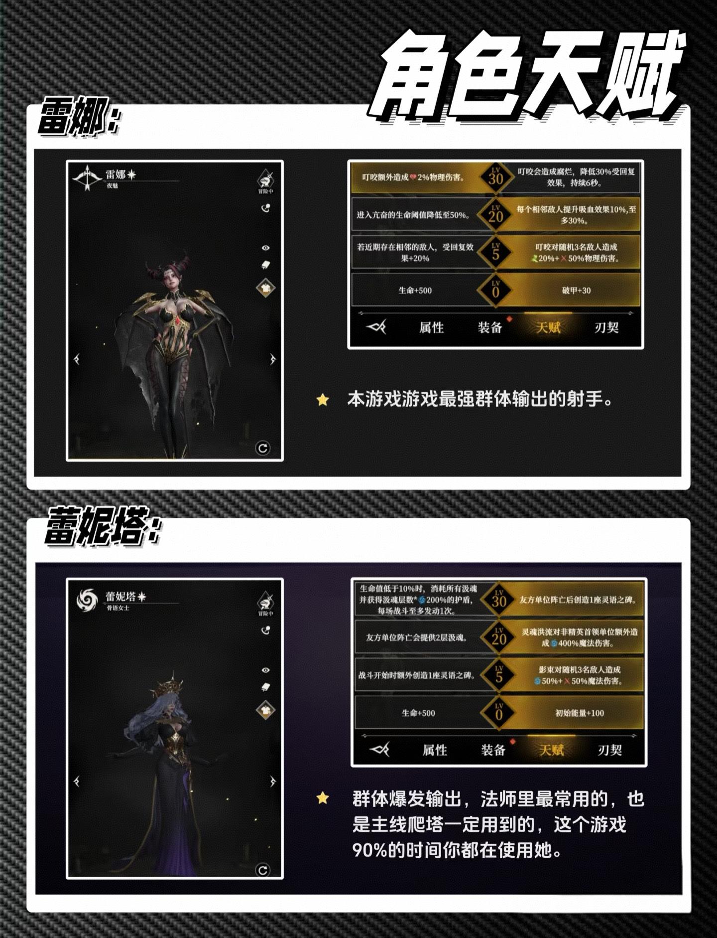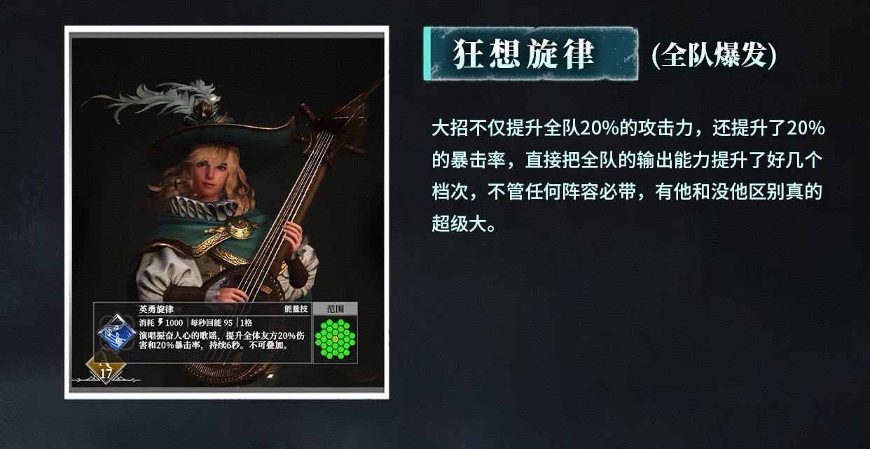 核心推荐:狂想旋律,需通过人性系统解锁,大招提供全体20%攻击+20%暴击率加成,被动附带沉默控制,是“任何阵容都能塞”的爆发拐,有无她堪称两个游戏体验。