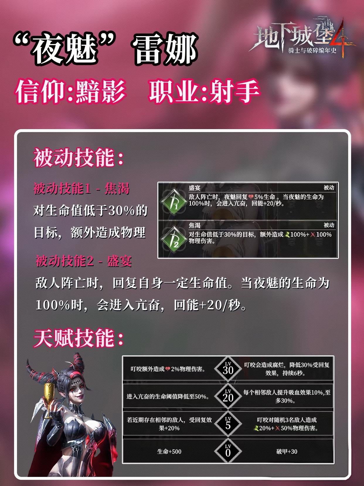 核心推荐:蕾娜(夜魅),大招AOE伤害叠加低血量增伤,附带回血回能效果,需通过混沌人性解锁,解锁后可作为物理核心培养。