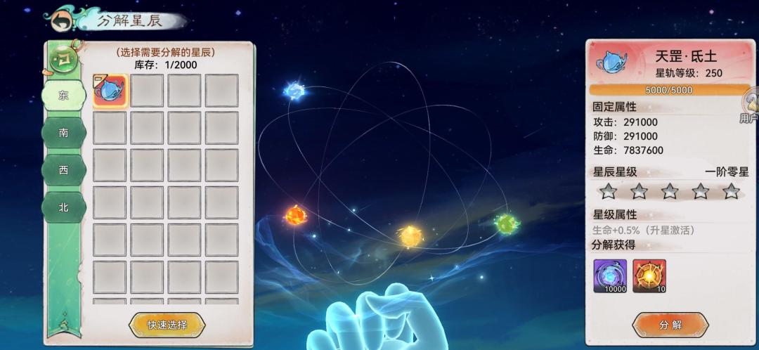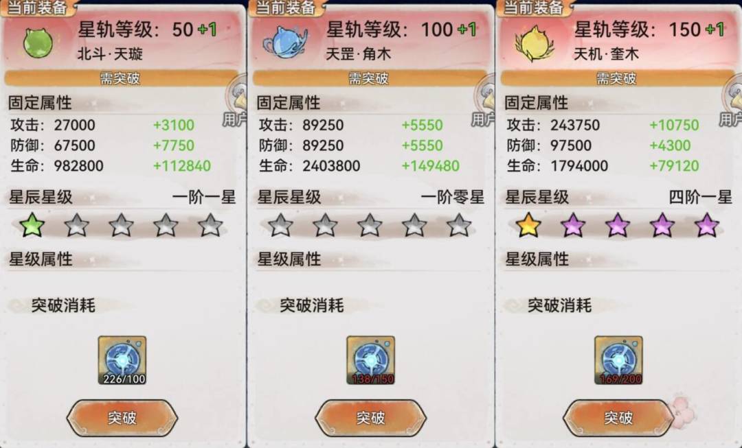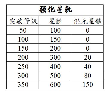 星辰是目前本游戏提升战力的高效方式之一,东、西、南、北四条星轨等级每50级就需要突破一次。以下是每次突破需要消耗的道具。