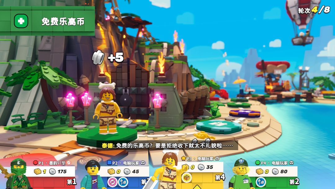 每次小游戏结束之后,并不会直接进入下一个小游戏,而是会开启一个类似“大富翁”一样的强手棋玩法。在强手棋里,玩家拥有乐高币和金砖两种货币,金钻的多少决定着最终的胜利者是谁,而乐高币则可以用来购买金钻。轮到自己的回合里,玩家可以掷出一个8面骰子,随机到几,就走几步。由于每一轮小游戏的排名不仅决定选手能得到多少乐高币,还将决定在强手棋上的摇骰子的顺序,所以玩家需要在小游戏里尽可能得分,才能在强手棋里抢占先机。
