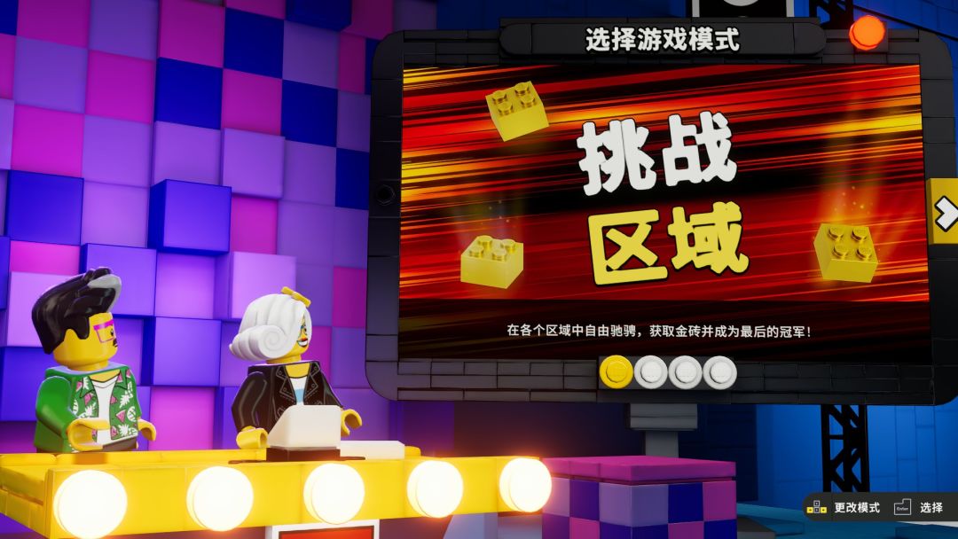 游戏是综艺的形式展开的,不仅有话痨一样的主持人,还有热情洋溢的观众们。在角色确认阶段,本作就表现出乐高游戏的高度个性化了。每一次的综艺比赛都需要四人参加,不管是本地多人,还是在线多人,都可以。就算你今天实在找不到人,也可以一个人匹配3个电脑AI,进行单人挑战,也不是不行。在准备阶段,游戏提供了46种不同形象的小人供玩家选择,而且,这仅仅只是初始小人,后续还能解锁100多个额外小人,绝对的差异化造型。