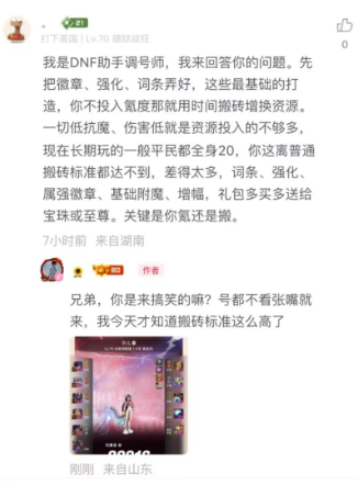 在dnf手游助手里,有一些大神玩家被官方特聘为了认证调号师,方便回答一些玩家打造上的问题,而就在昨天有人发文说自己求助时,被调号师嘲讽自己抗魔不够搬砖,明明都已经达成9.2万抗魔了