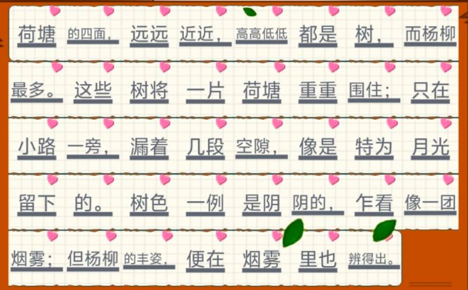 荷塘的四面,远远近近,高高低低都是树,而杨柳最多。这些树将一片荷塘重重围住;只在小路一旁,漏着几段空隙,像是特为月光留下的。树色一例是阴阴的,乍看像一团烟雾;但杨柳的丰姿,便在烟雾里也辨得出。