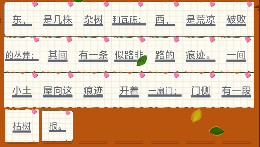 东,是几株杂树和瓦砾;西,是荒凉破败的丛葬;其间有一条似路非路的痕迹。一间小土屋向这痕迹开着一扇门;门侧有一段枯树根。