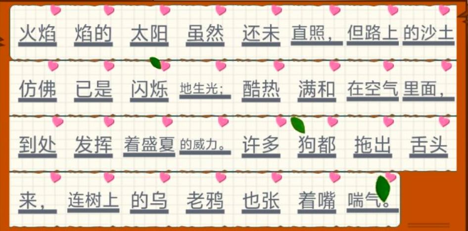火焰焰的太阳虽然还未直照,但路上的沙土仿佛已是闪烁地生光;酷热满和在空气里面,到处发挥着盛夏的威力。许多狗都拖出舌头来,连树上的乌老鸦也张着嘴喘气。
