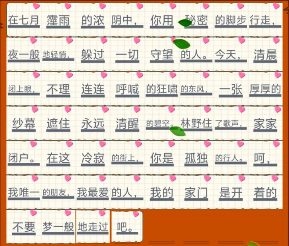 在七月霪雨的浓阴中,你用秘密的脚步行走,夜一般地轻悄,躲过一切守望的人。今天,清晨闭上眼,不理连连呼喊的狂啸的东风,一张厚厚的纱幕遮住永远清醒的碧空。林野住了歌声,家家闭户。在这冷寂的街上,你是孤独的行人。呵,我唯一的朋友,我最爱的人,我的家门是开着的不要梦一般地走过吧。