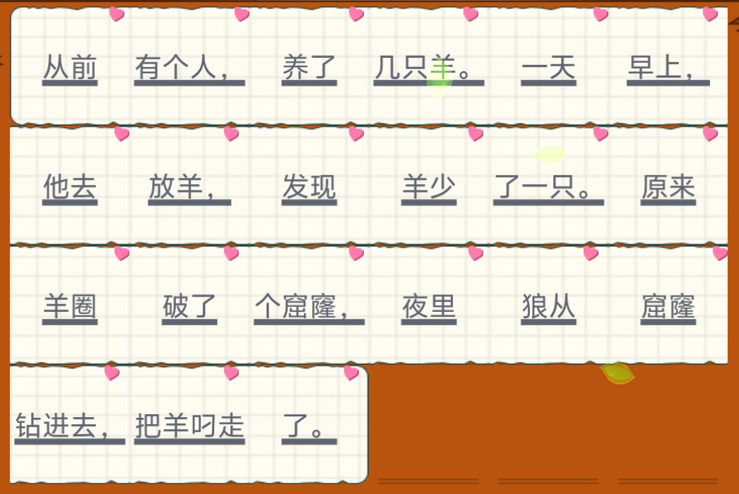 从前有个人,养了几只羊。一天早上,他去放羊,发现羊少了一只。原来羊圈破了个窟窿,夜里狼从窟窿钻出去,把羊叼走了。