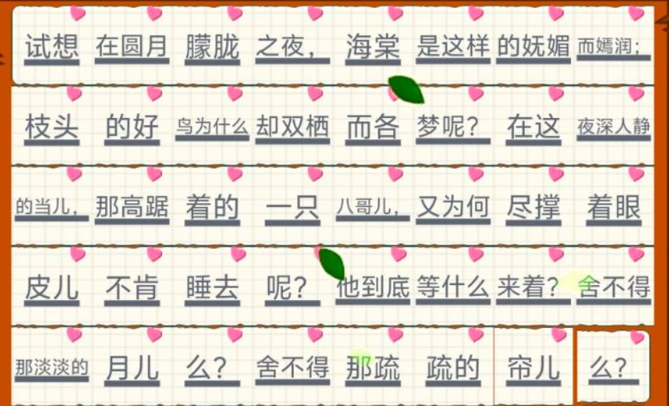 试想在圆月朦胧之夜,海棠是这样的妩媚而嫣润;枝头的好鸟为什么却双栖而各梦呢?在这夜深人静的当儿,那高踞着的一只八哥儿,又为何尽撑着眼皮儿不肯睡去呢?他到底等什么来着?舍不得那淡淡的月儿么?舍不得那疏疏的帘儿吗?
